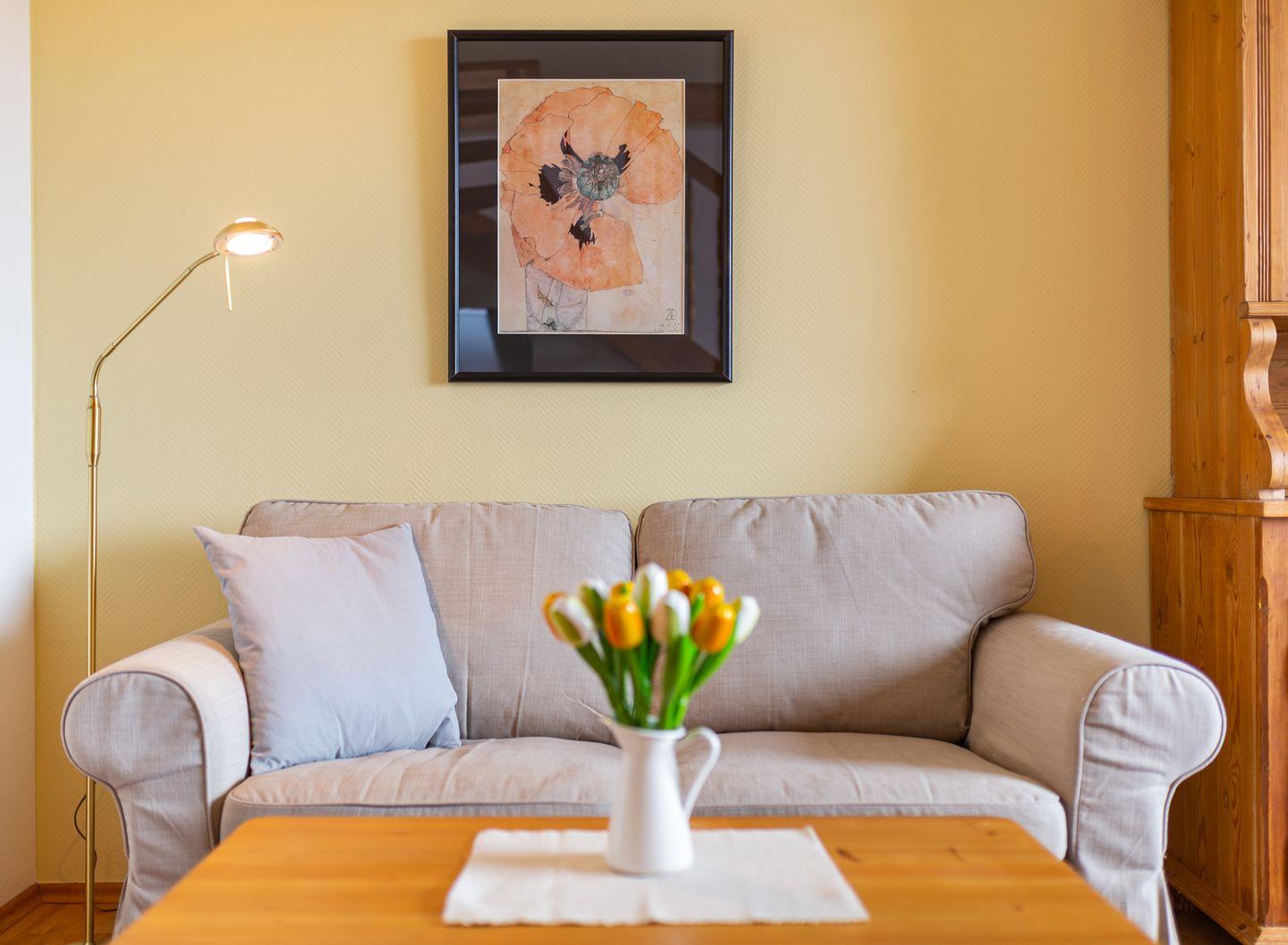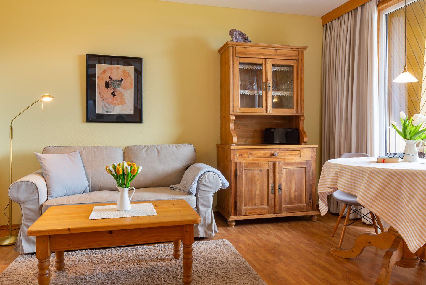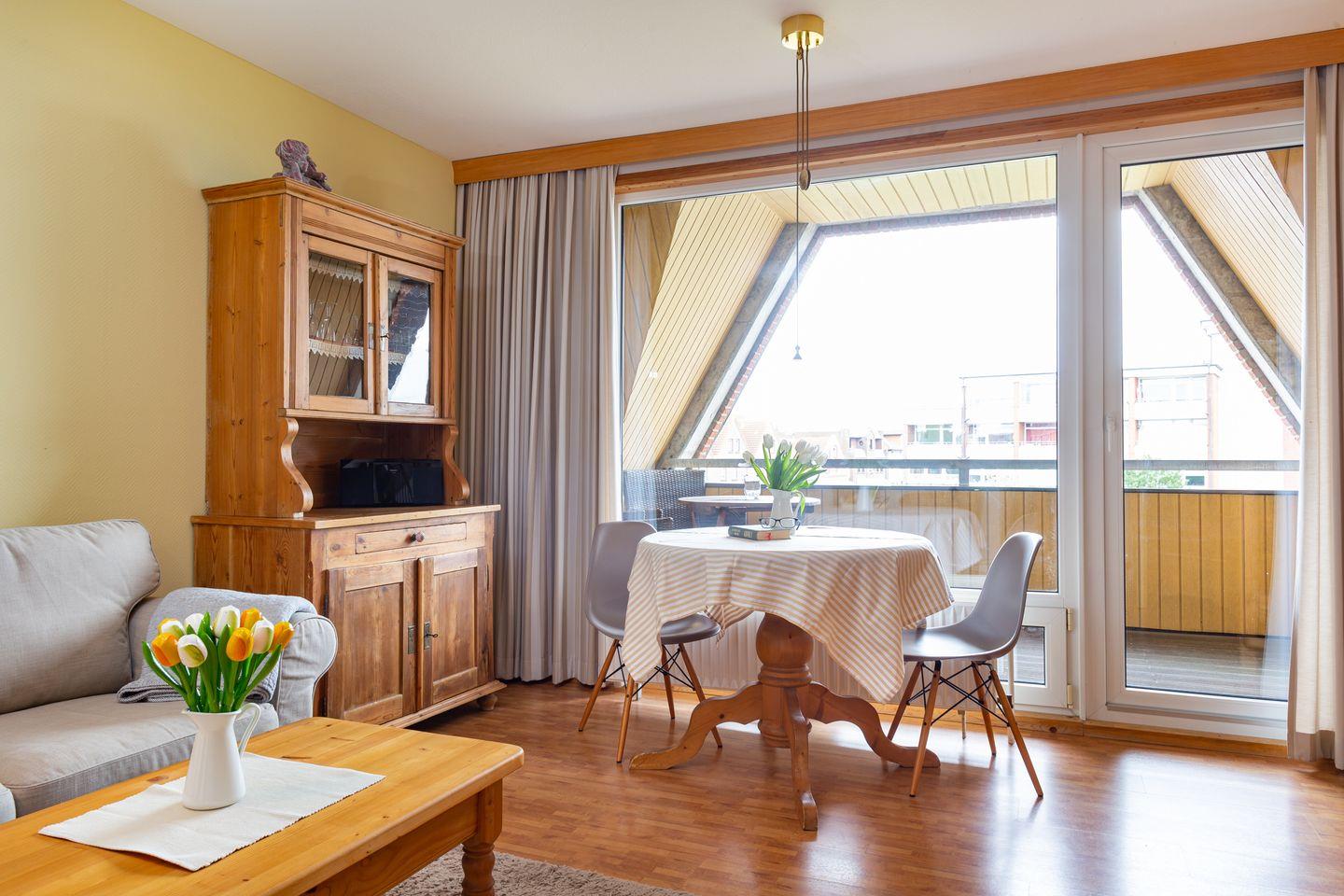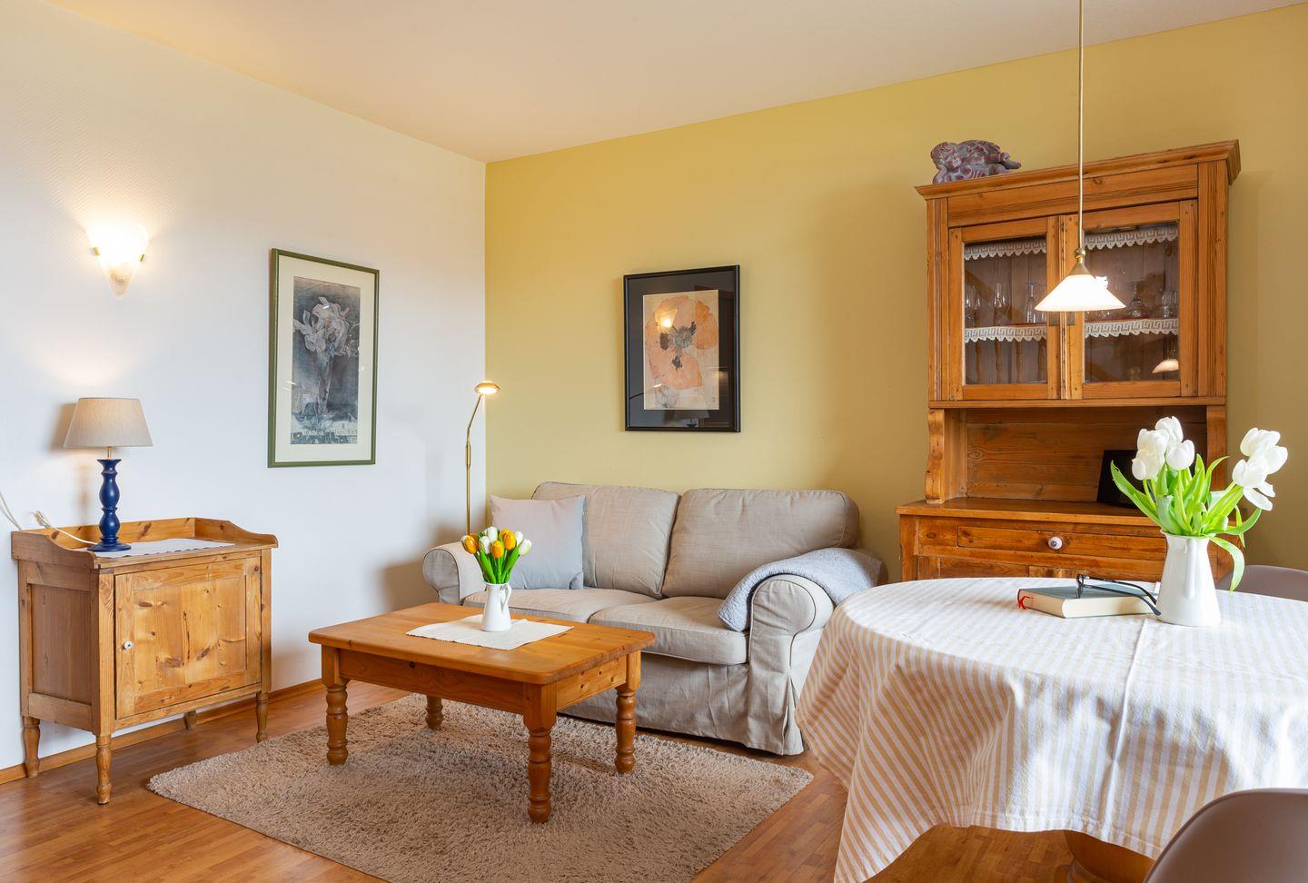 Die Wohnung verfügt über ein Wohnzimmer mit separatem Schlafzimmer mit Boxspringbett, eine voll ausgestattete Küche mit Geschirrspüler, ein Duschbad, einen Balkon mit Meerblick und WLAN. Wohnzimmer und Schlafzimmer sind jeweils mit einem Flachbild TV Gerät ausgestattet. Ein Parkplatz ist ebenfalls vorhanden. Gepflegte Fahrräder stehen zu Ihrer freien Nutzung bereit.
