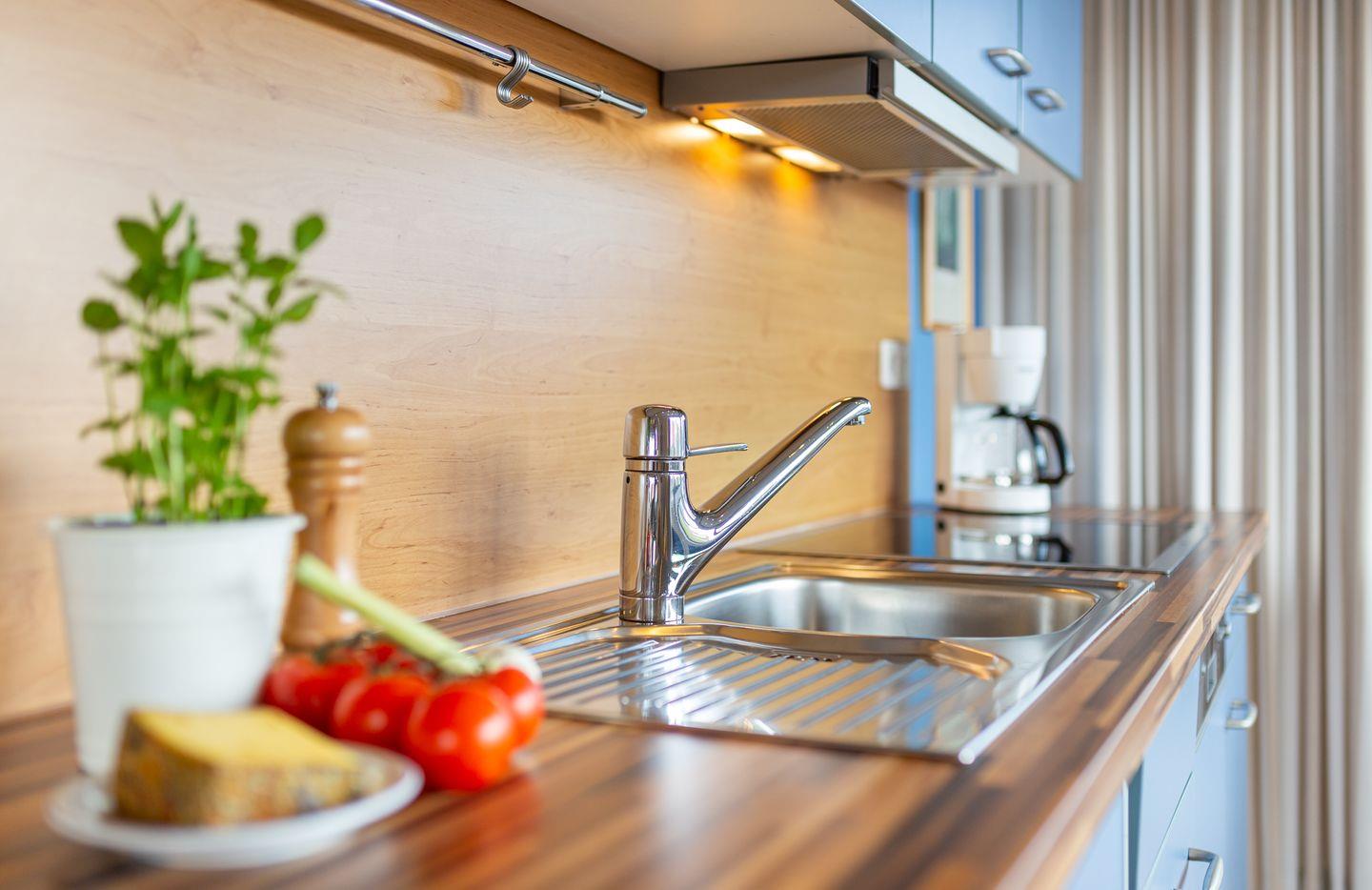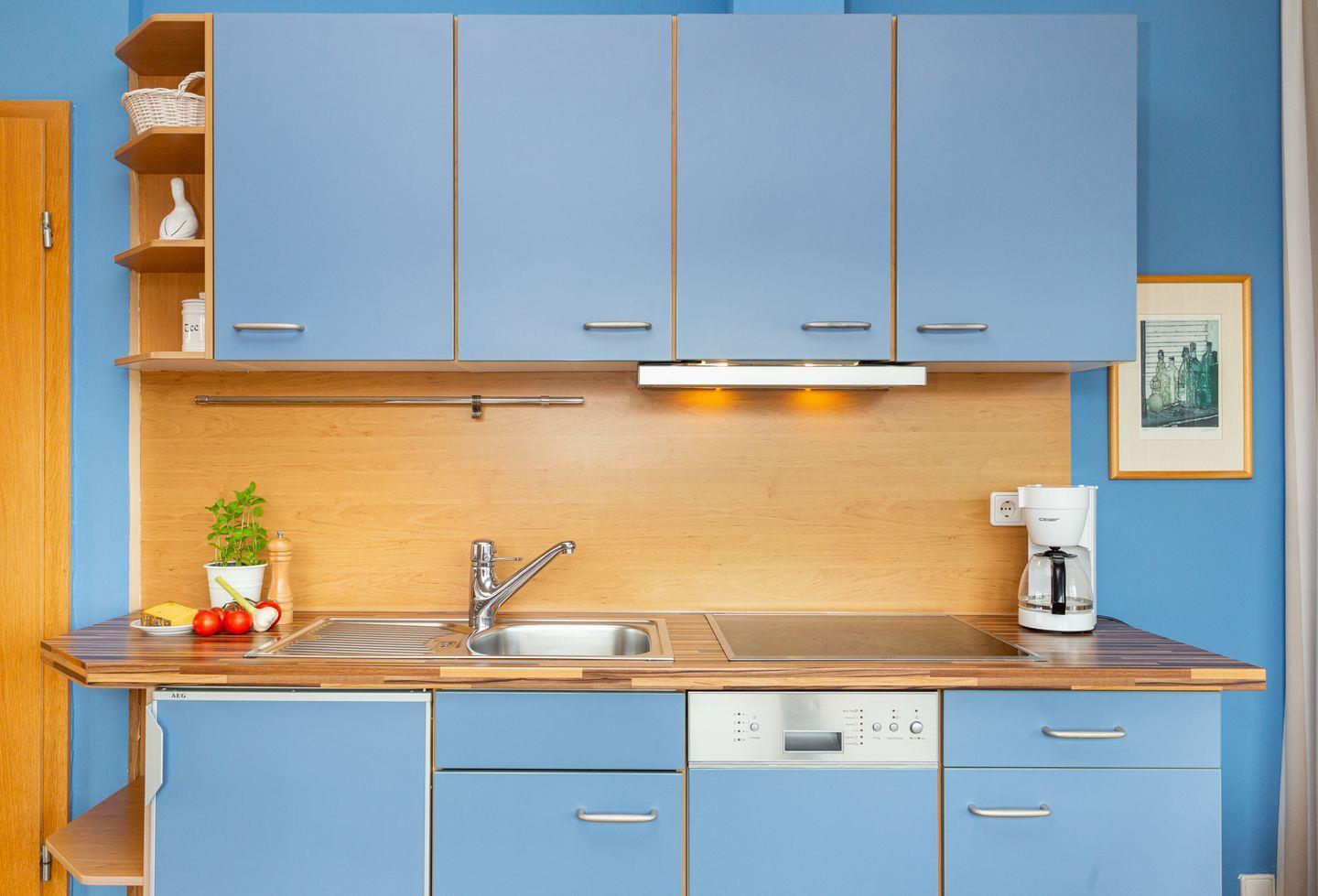 Die Wohnung verfügt über ein Wohnzimmer mit separatem Schlafzimmer mit Boxspringbett, eine voll ausgestattete Küche mit Geschirrspüler, ein Duschbad, einen Balkon mit Meerblick, Satelliten TV und WLAN.