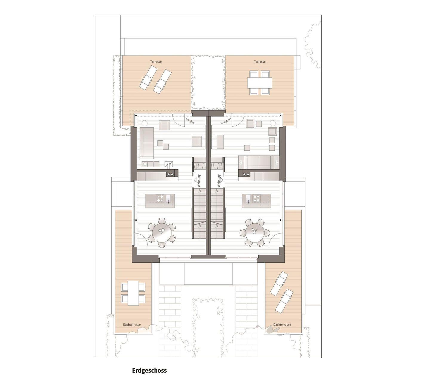 Das Architektenhaus mit einer modernen Innenausstattung wird von der Mittelstraße über einen Eingangshof mit Carport erreicht. Der Grundriss ist der Topografie der Düne angepasst und umfasst 3 Wohngeschosse. Die große Wohnung im Erd- und Dachgeschoss wird über eine Treppe erreicht. Im Erdgeschoss befindet sich ein großzügiger Wohnbereich der über raumhohe Fenster eine direkte Verbindung zu den Außenbereichen herstellt. Auf der Südseite zur großen Gartenterrasse, an der Ost- bzw. Westseite zum Dachgarten mit Blick auf den Inselpark. Die Räume sind lichtdurchflutet und harmonisch gestaltet.