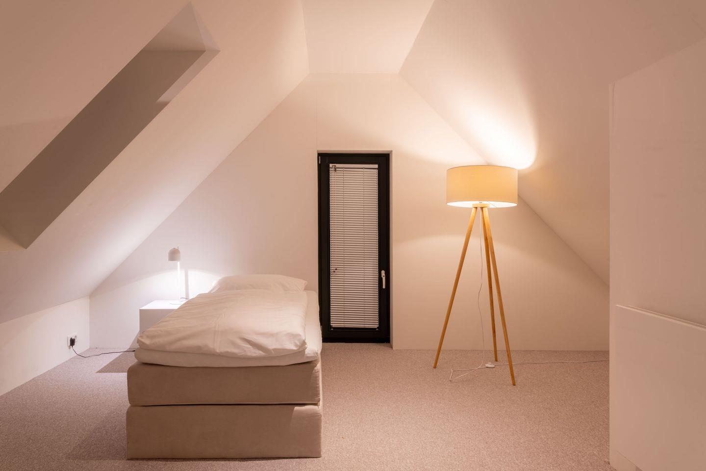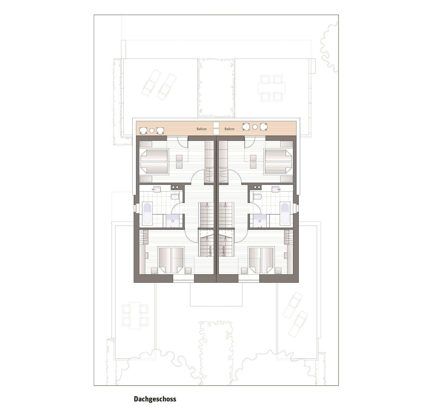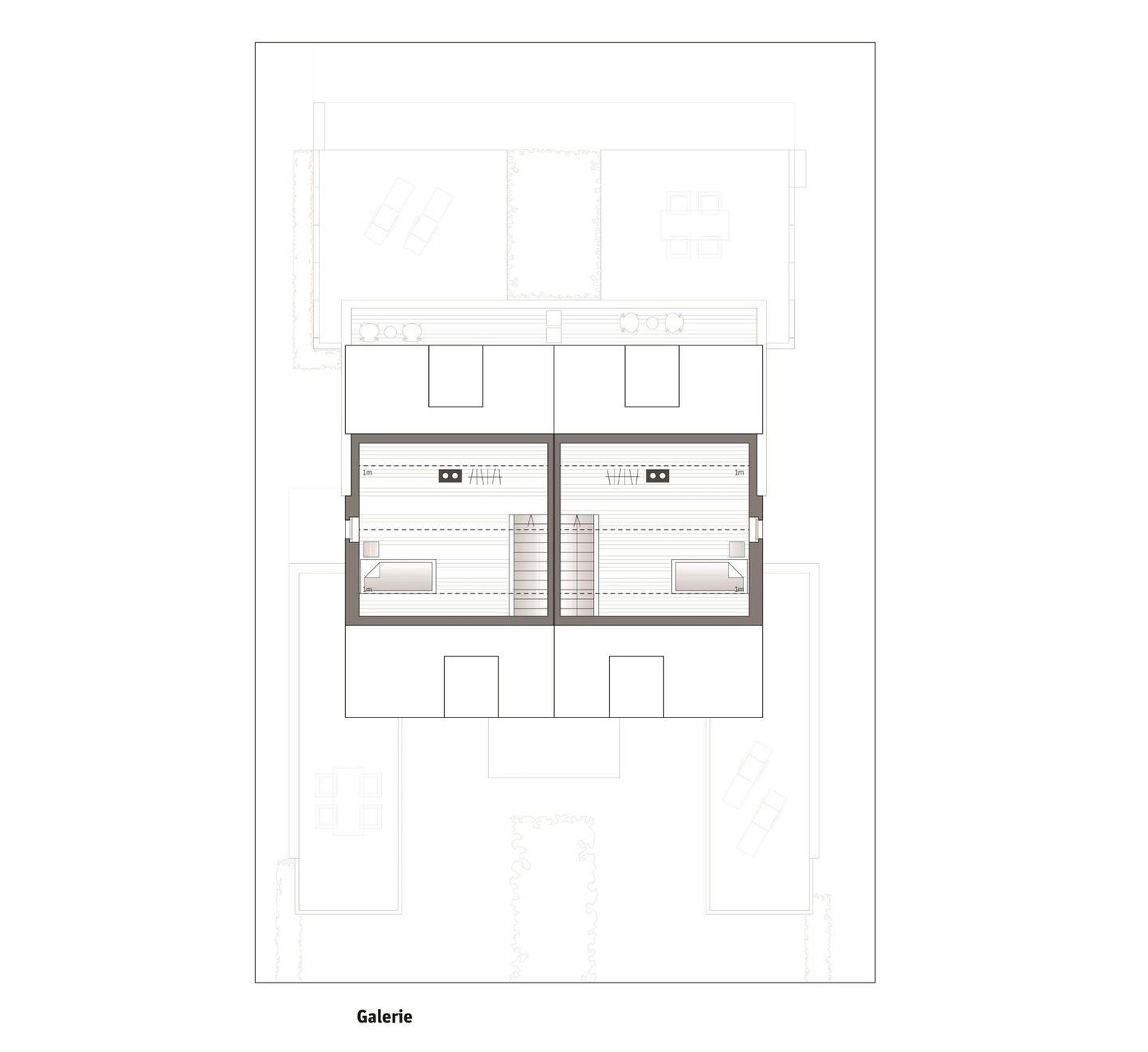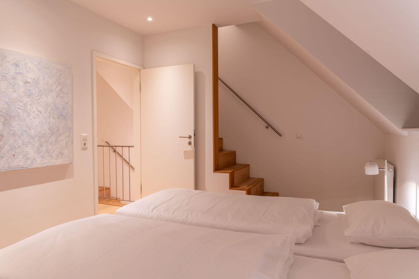 Das Dachgeschoss hat einen Balkon und 2 Schlafräume mit Boxspringbetten und Einbauschrank. Ein elegantes Bad mit Dusche, Badewanne und WC komplettiert das Raumangebot. Die Galerie im Spitzboden des Hauses mit maximal 2 Schlafplätzen ist über eine Treppe mit dem Dachgeschoss verbunden. Ein zusätzliches separates WC befindet sich im Eingangsgeschoss.