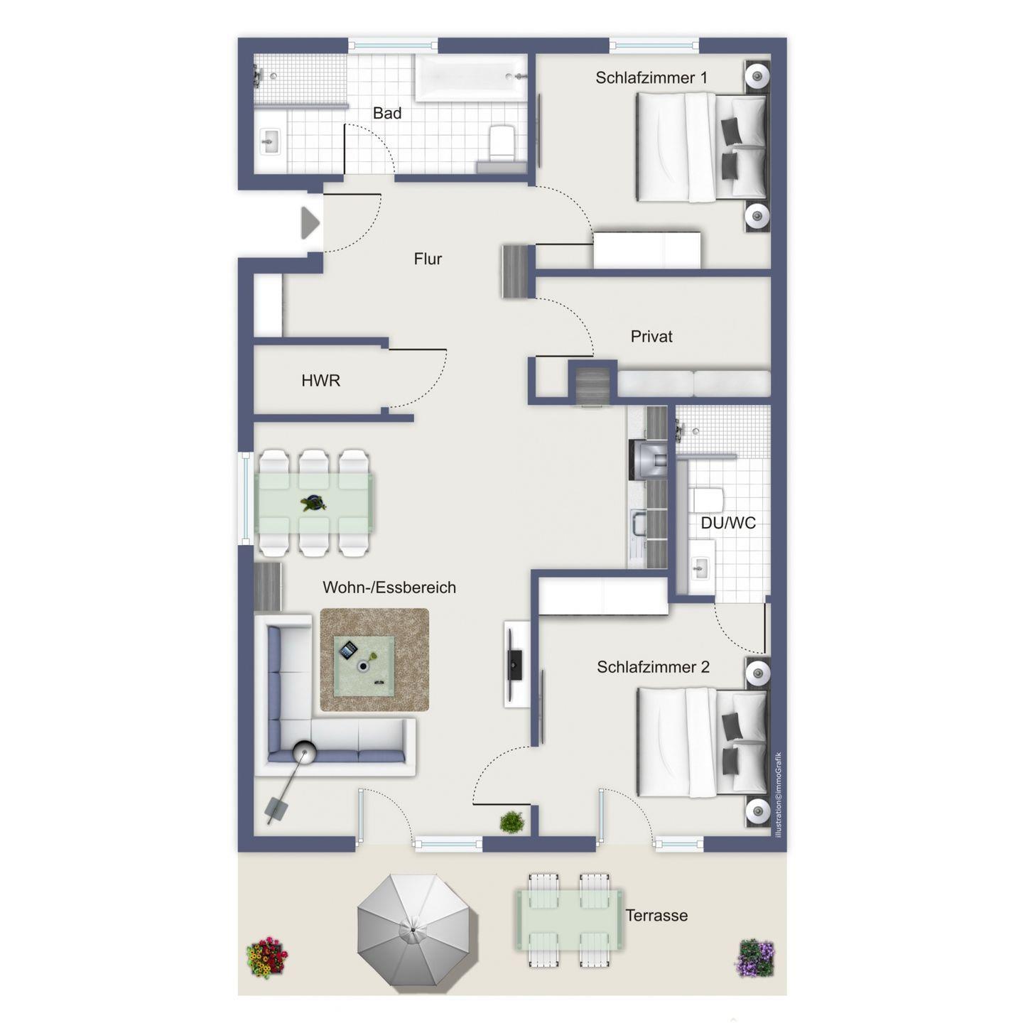 Der Bereich Meer in dem "Haus am Wald" ist eine 3-Zimmer-Wohnung mit einer Größe von etwa 80 m². Zu dem Bereich gehört eine Terrasse.