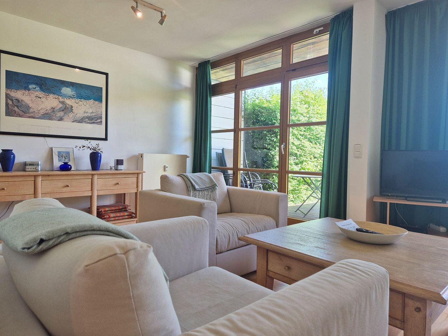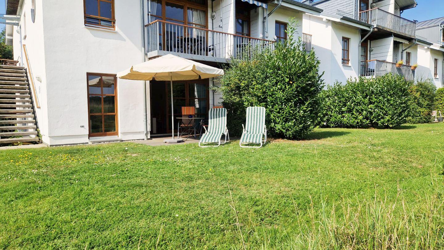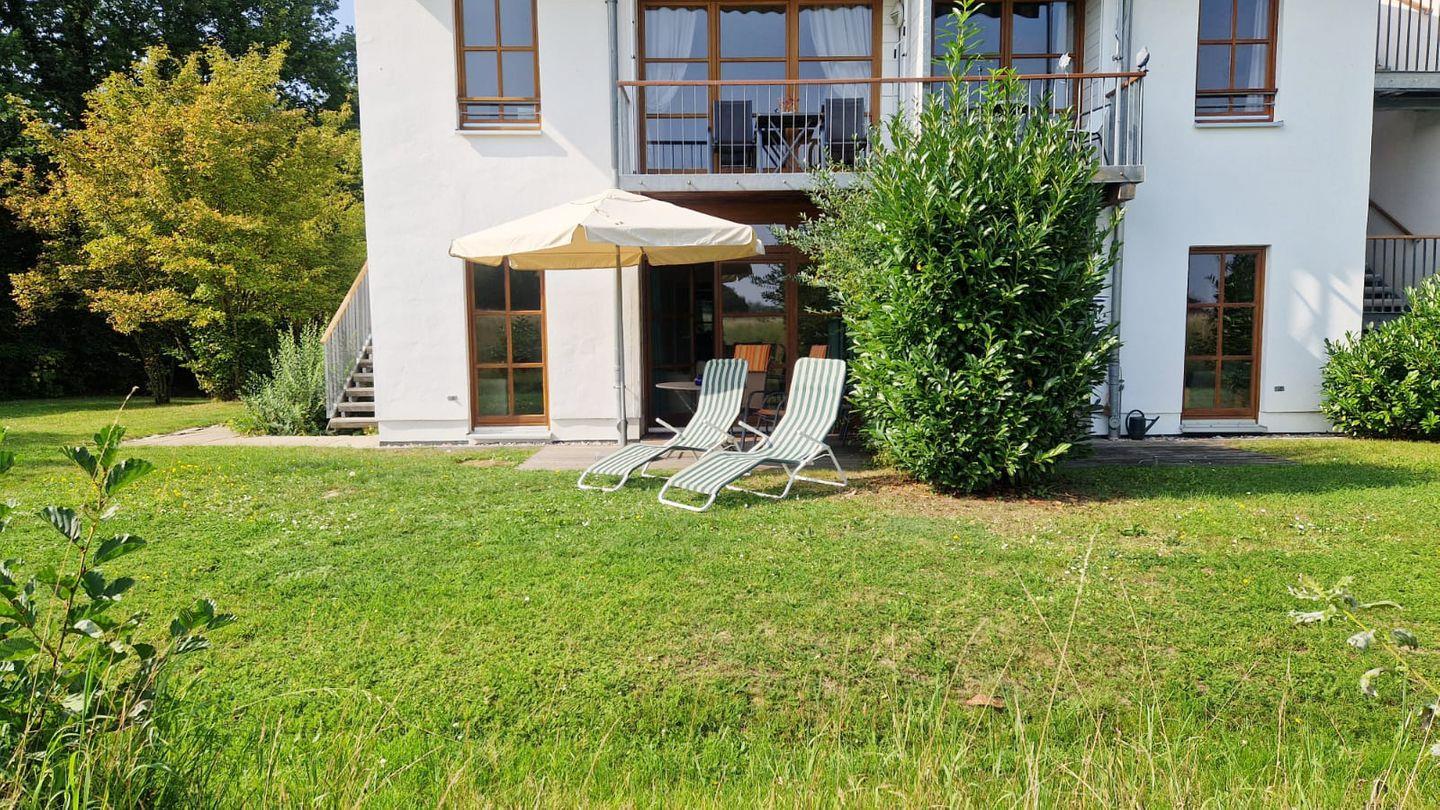 Ein Schlafzimmer bietet Zugang zu einem Westbalkon, vom Wohnzimmer aus gelangt man auf die Terrasse mit eigenem 120?m² Gartenanteil in Ost-, Süd- und Westrichtung. Gartenmöbel und -liegen stehen zur Verfügung.