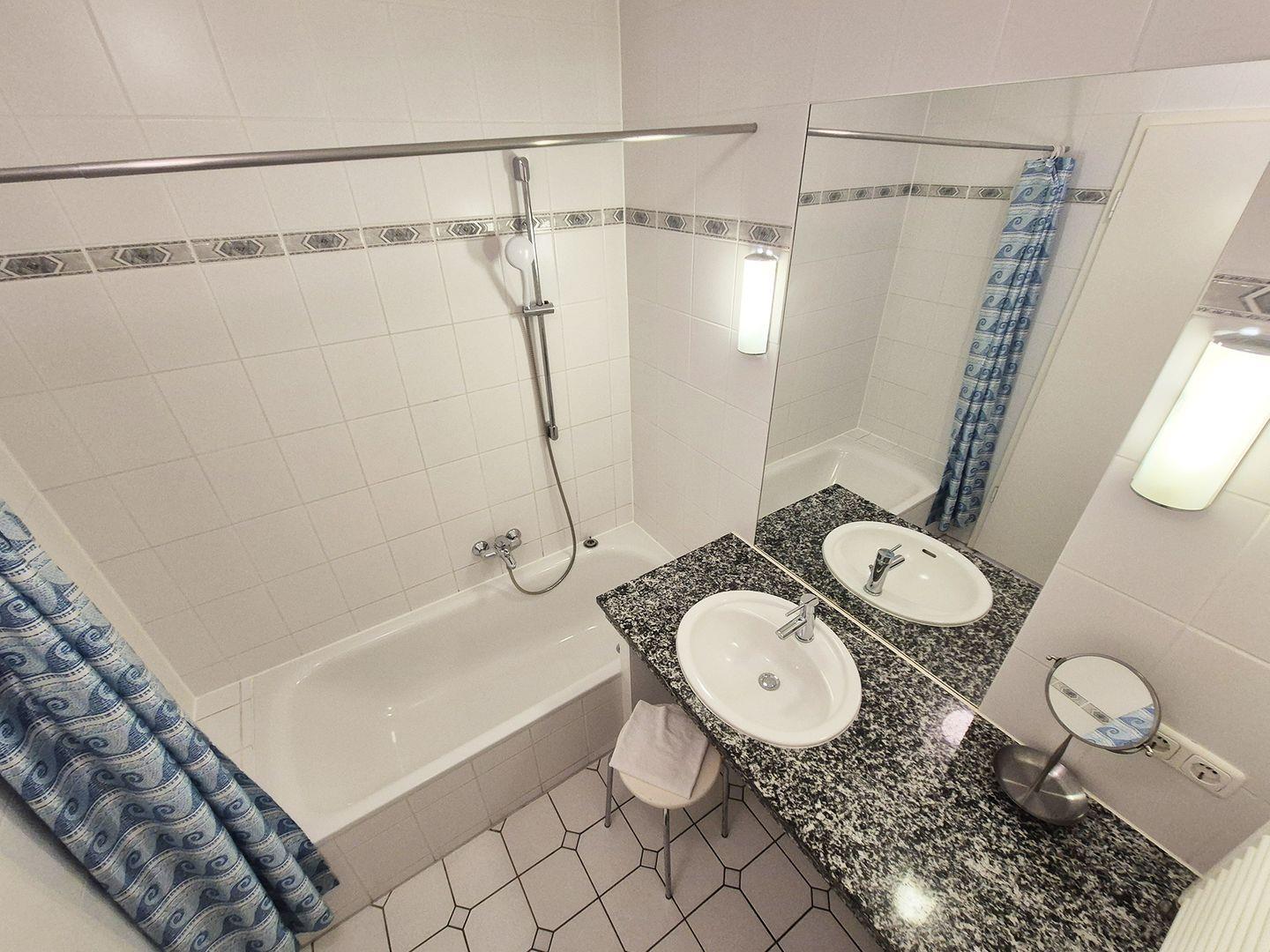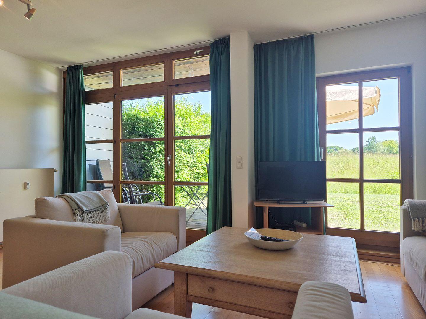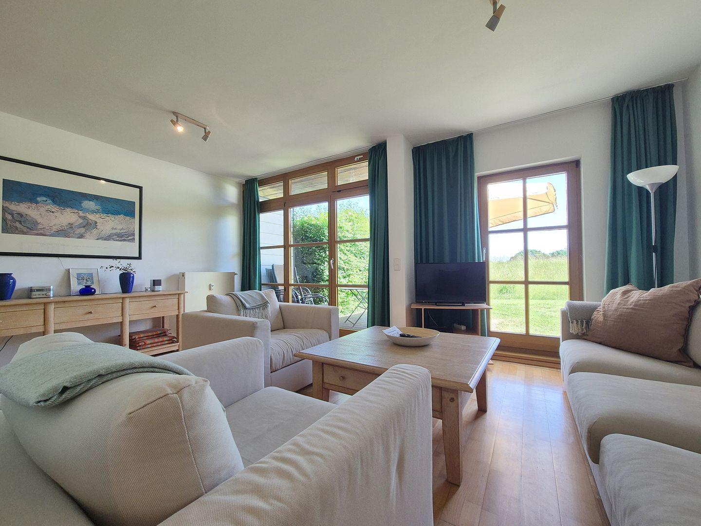 Großzügige & gemütliche 3-Raumwohnung mit einer Wohnfläche von ca. 75?m². Die separate Küche ist voll ausgestattet mit E-Herd, Backofen, Geschirrspüler, Mikrowelle & Kühlschrank mit Gefrierfach. Im Wohnzimmer befindet sich eine gemütliche Sitzecke mit einem Schlafsofa. Ebenfalls vorhanden: Fernseher, DVD- & CD-Player, Radio, Kinderstuhl sowie eine Essecke für bis zu 6 Personen.