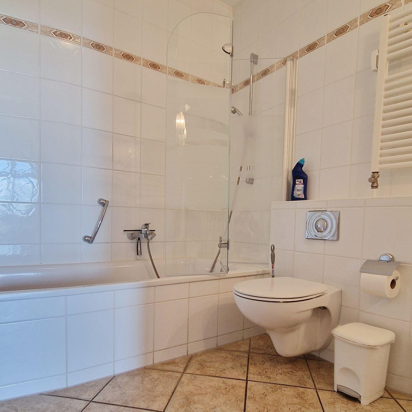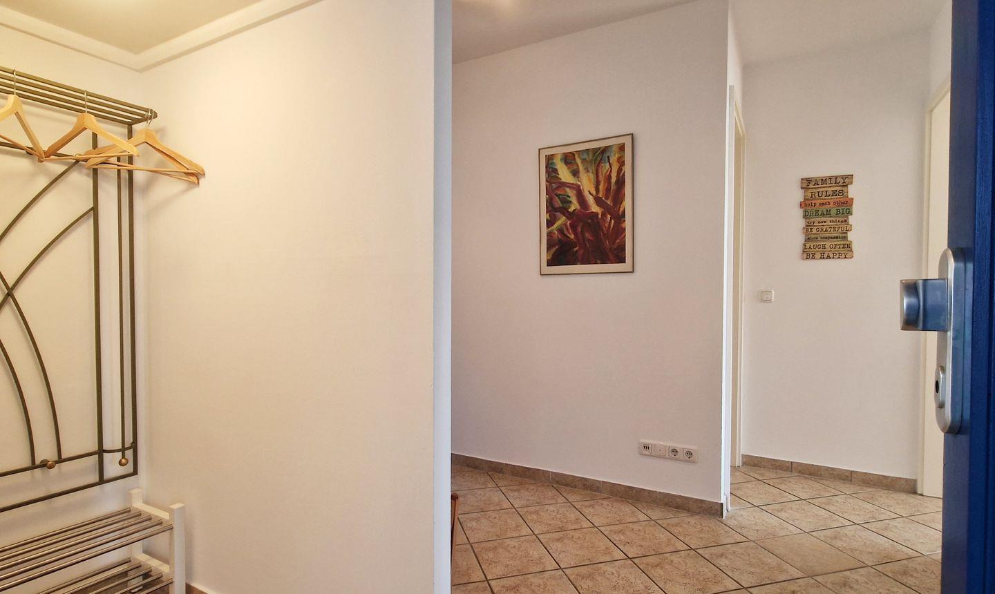 Im Wohnzimmer befindet sich eine bequeme Sitzecke mit Smart-TV (ARD ist verfügbar; für weitere Sender wird ein Stick benötigt) sowie Zugang zum Ostbalkon.