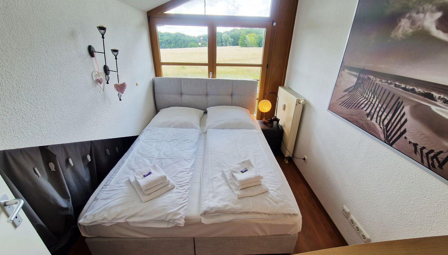 Das Schlafzimmer hat ein Doppelbett (160 x 200cm), eine Kommode und einen 2. TV. Hier gibt es auch noch eine kleine Schlafnische unter der Dachschrägen mit einem Rennautobett für die Kleinen. Es ist auch perfekt als Spielecke für Kinder.