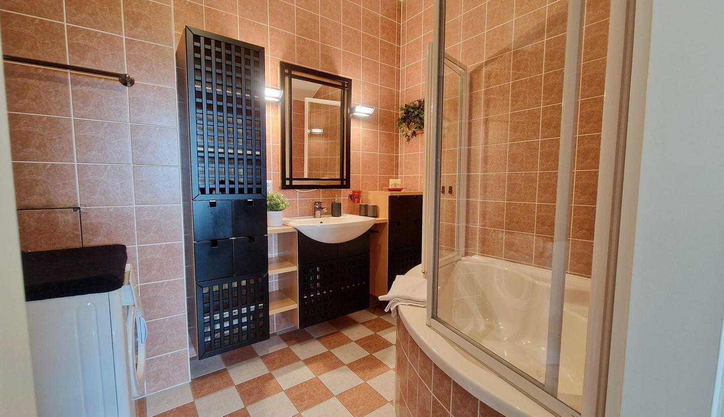 Das Bad ist großzügig und verfügt über ein WC, Waschbecken und eine Eckebadewanne mit Dusche. Dazu kommt noch ein Waschtrockner.