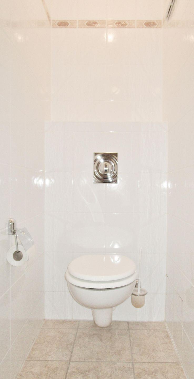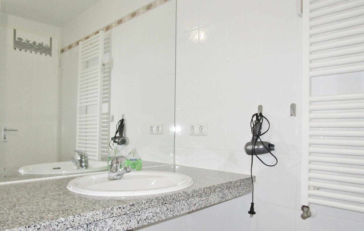 Das moderne und helle Badezimmer verfügt über eine Dusch-Badewanne, einen großen Waschtisch, einen Föhn sowie einen Handtuch-Heizkörper. Das WC befindet sich in einem separaten Raum.