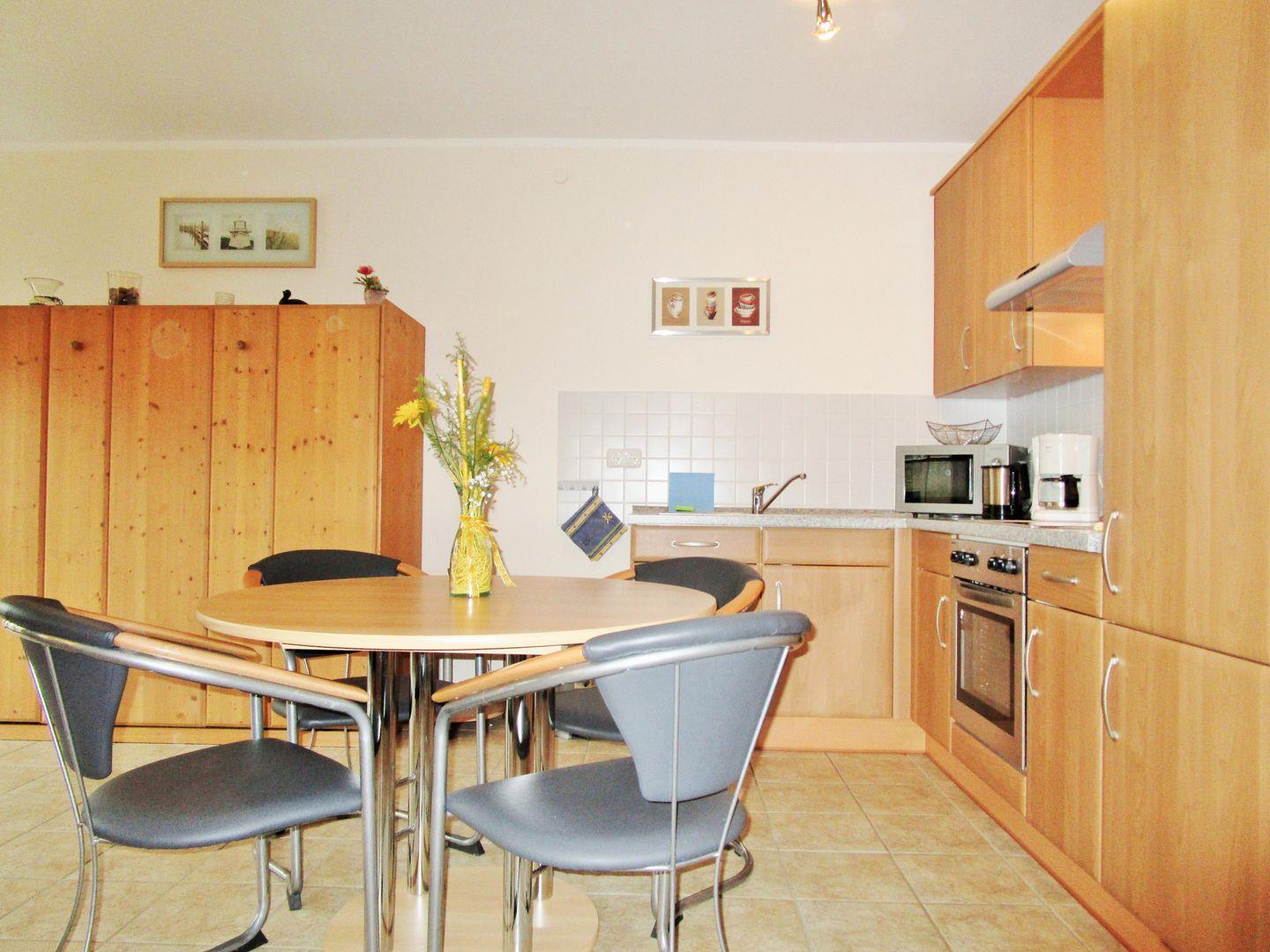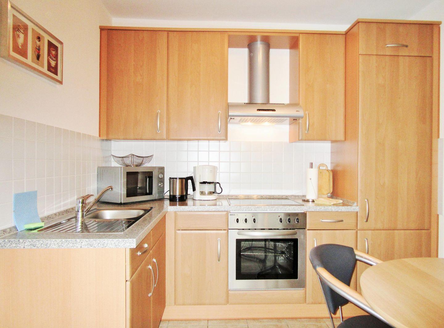 Die offene Küche beinhaltet eine voll ausgestattete Einbauküchenzeile mit 4-Platten-Ceran-Kochfeld, Backofen, Dunstabzug, Mikrowelle, Kühlschrank mit Gefrierfach, Kaffeemaschine, Wasserkocher, Toaster und Eierkocher. Die Küche ist mit Geschirr, Gläsern, Besteck und Töpfen bestens und ausreichend ausgestattet.
