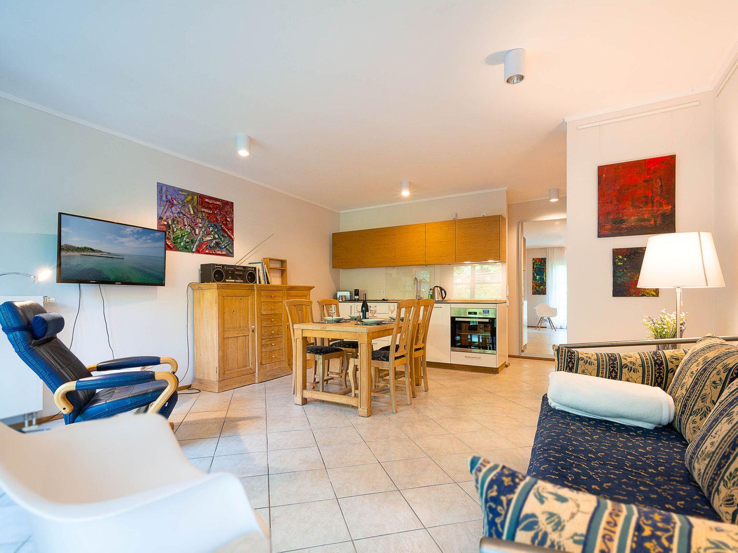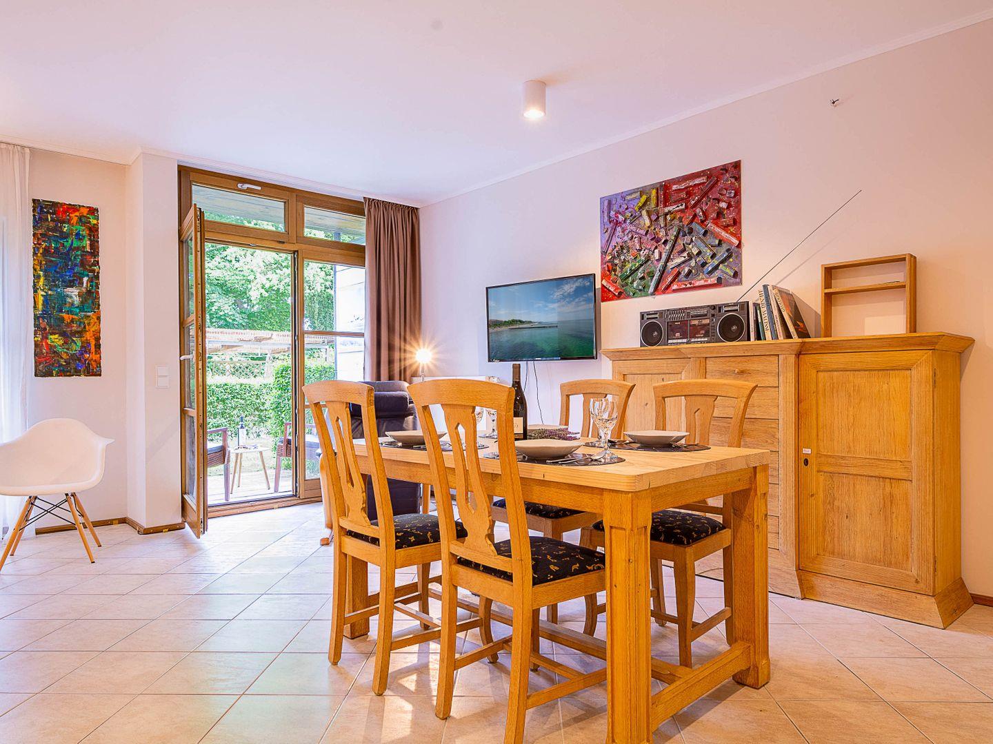 Der mit viel Liebe und individuellen Details gestaltete Wohnbereich lädt mit einem bequemen Sofa, einem gemütlichen Schwingsessel und einem modernen TV zum Entspannen ein. Gleich daneben befindet sich der stilvolle Essbereich, an dem Sie Ihre Mahlzeiten genießen können. Für die passende Atmosphäre sorgt zudem ein Radio.
