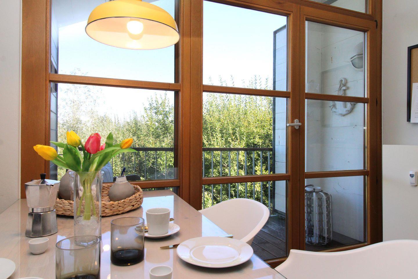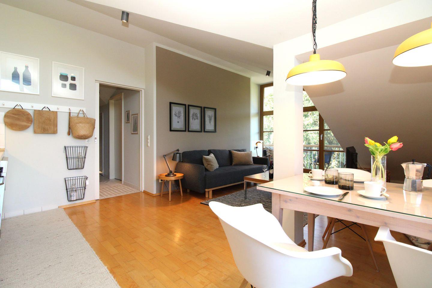 Das lichtdurchflutete und moderne Wohn-/Esszimmer mit großen bodentiefen Fenstern verfügt über eine separate Sitzgruppe mit bequemer ausziehbarer (Schlaf)-Couch, Sessel und Couchtisch, einen separaten Esstisch mit 4 Stühlen sowie verschiedene Regale. Vom Wohnzimmer aus haben Sie direkten Zugang zu den 2 großen und teilweise überdachten Balkonen (nach Nord-Osten bzw. Süd-Westen ausgerichtet) mit Balkonmöbeln. Hier sitzen Sie entspannt und gemütlich mitten im Grünen und können abends bei einem guten Glas Wein in Ruhe die lauen Sommernächte genießen!