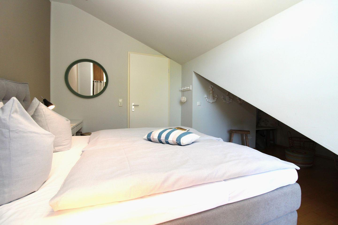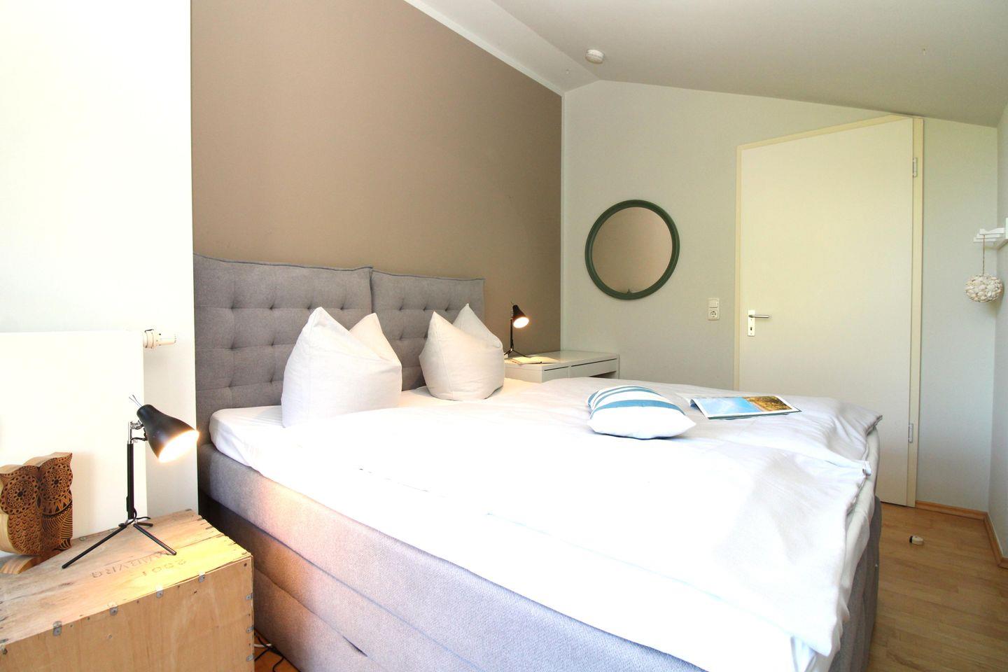 Das gemütliche Schlafzimmer ist mit einem bequemen Boxspring-Doppelbett (160 cm x 200 cm), Nachttischen mit Nachttischlampen, einem Schreibtisch mit Hocker sowie einem geräumigen Kleiderregal eingerichtet und hat ebenfalls direkten Zugang zu dem großen und überdachten Süd-West-Balkon. Für einen guten Schlafkomfort verfügt das Schlafzimmer über Verdunkelungsvorhänge.