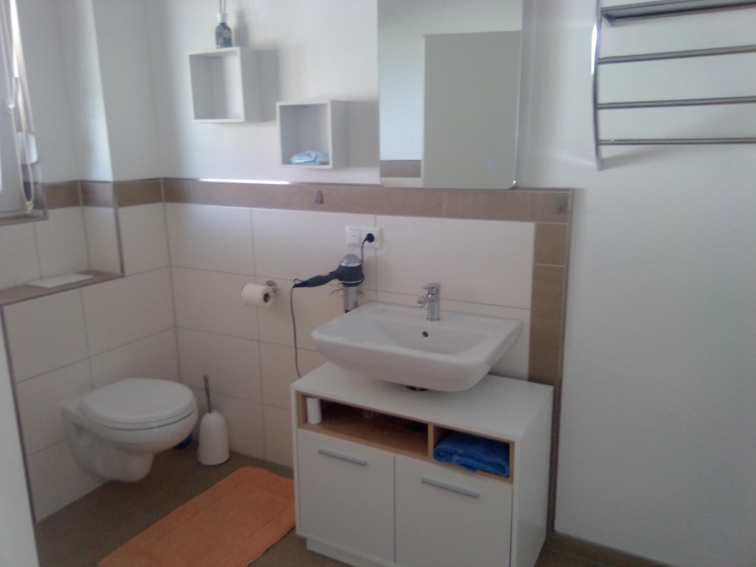 Bad: ebenerdige Dusche (1x1m), WC, Waschbecken, Waschmaschine