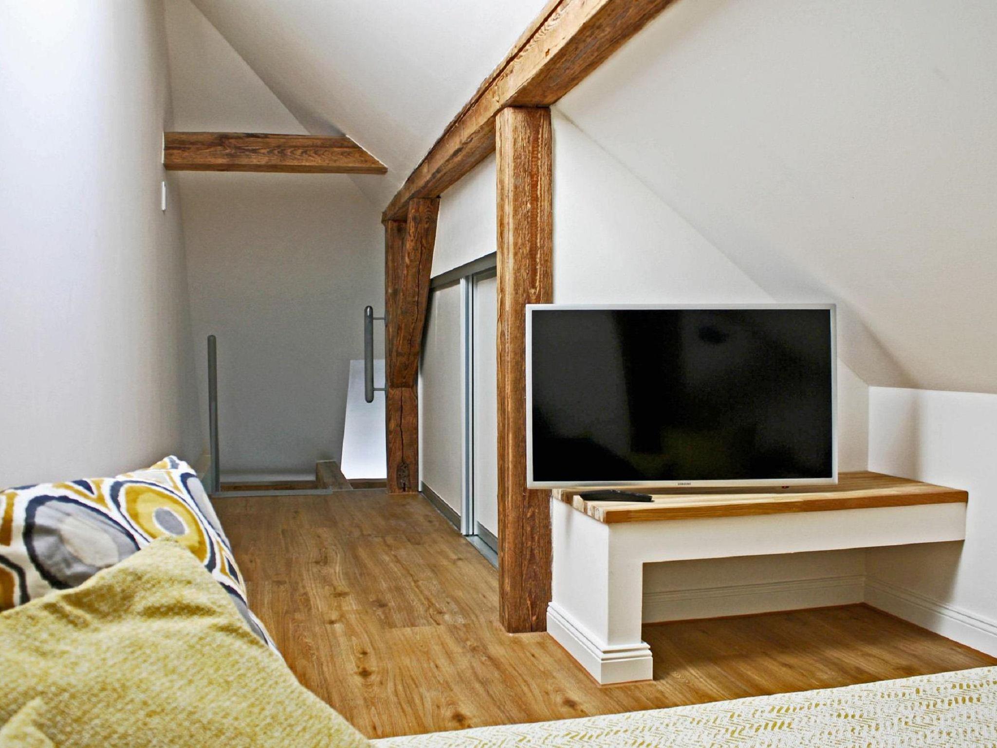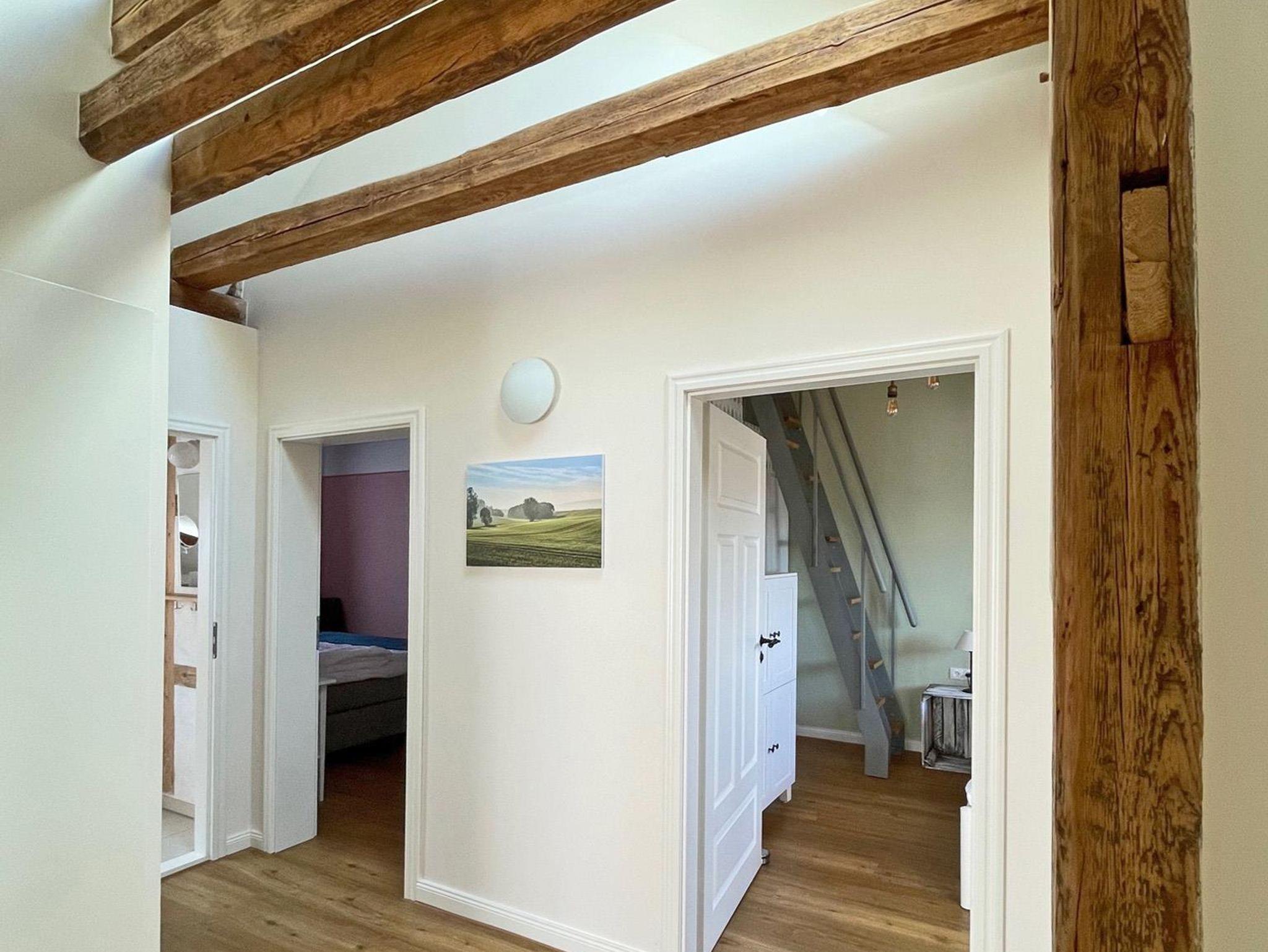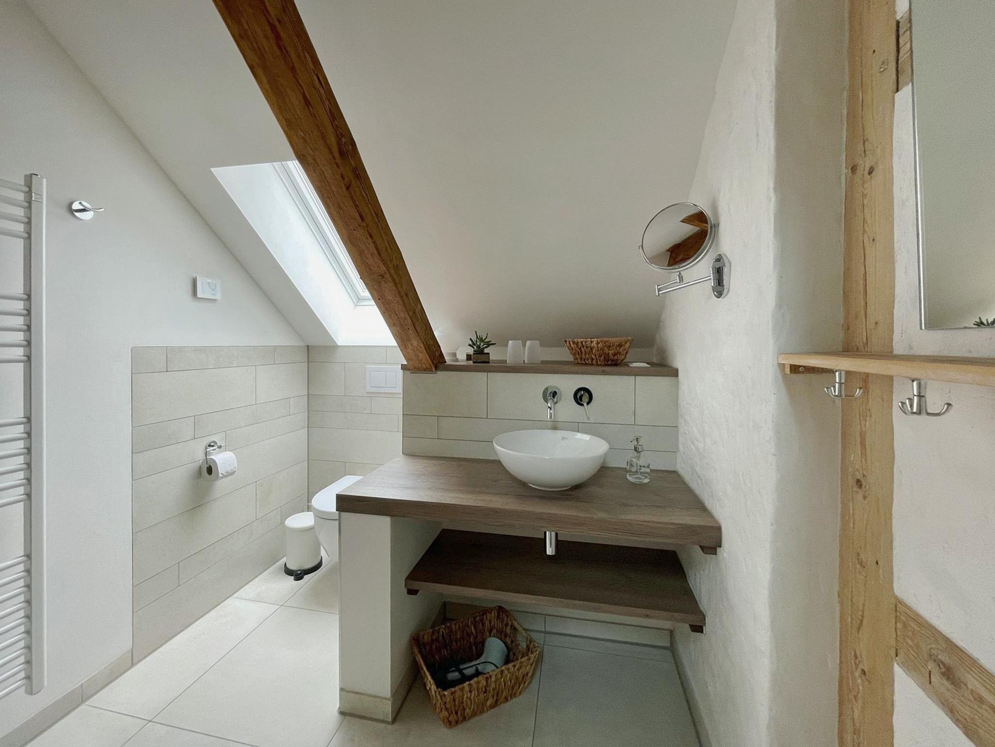 Im Obergeschoss befinden sich drei Schlafräume und zwei moderne Bäder. Das Gartenzimmer mit einem Doppelbett hat ein eigenes Bad und zudem einen Chillbereich im Spitzboden als Rückzugsort mit einem weiteren Fernseher. Das Bismarckzimmer verfügt über ein Boxspringbett, im Eisenbahnzimmer sind zwei Einzelbetten. Die beiden Bäder sind je mit einem Waschbecken, WC und einer Dusche ausgestattet und verfügen über Dachflächenfenster zur Be- und Entlüftung. Die Betten sind bezogen, für jeden Gast liegt ein Handtuchset bereit.