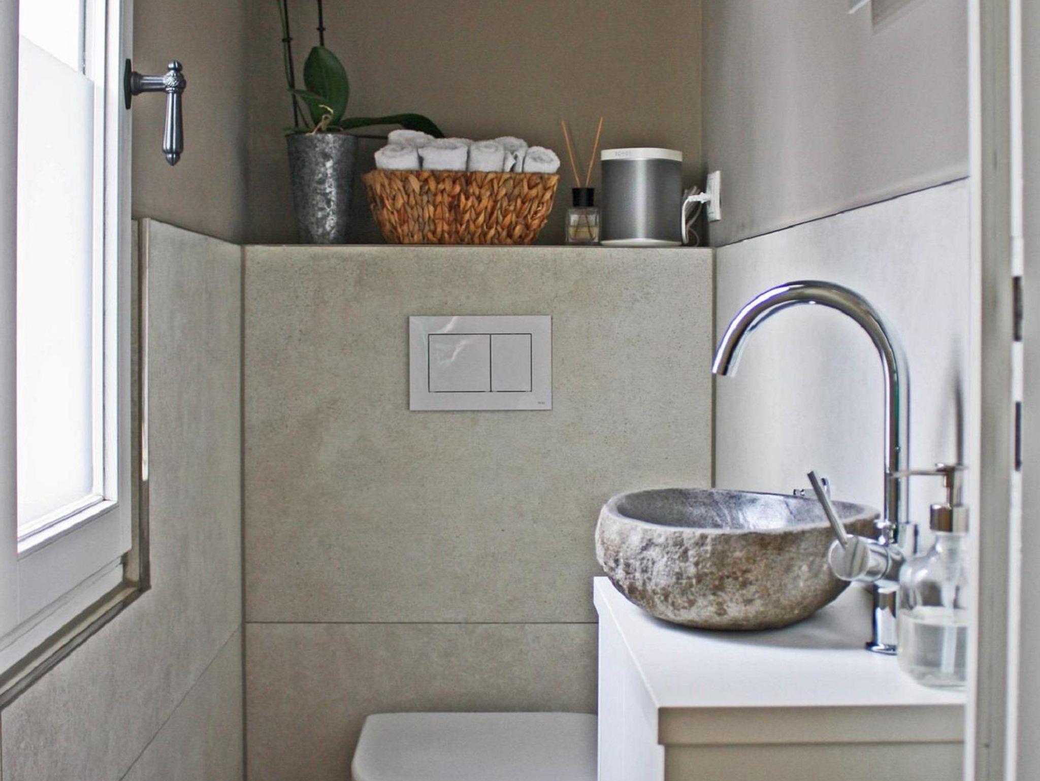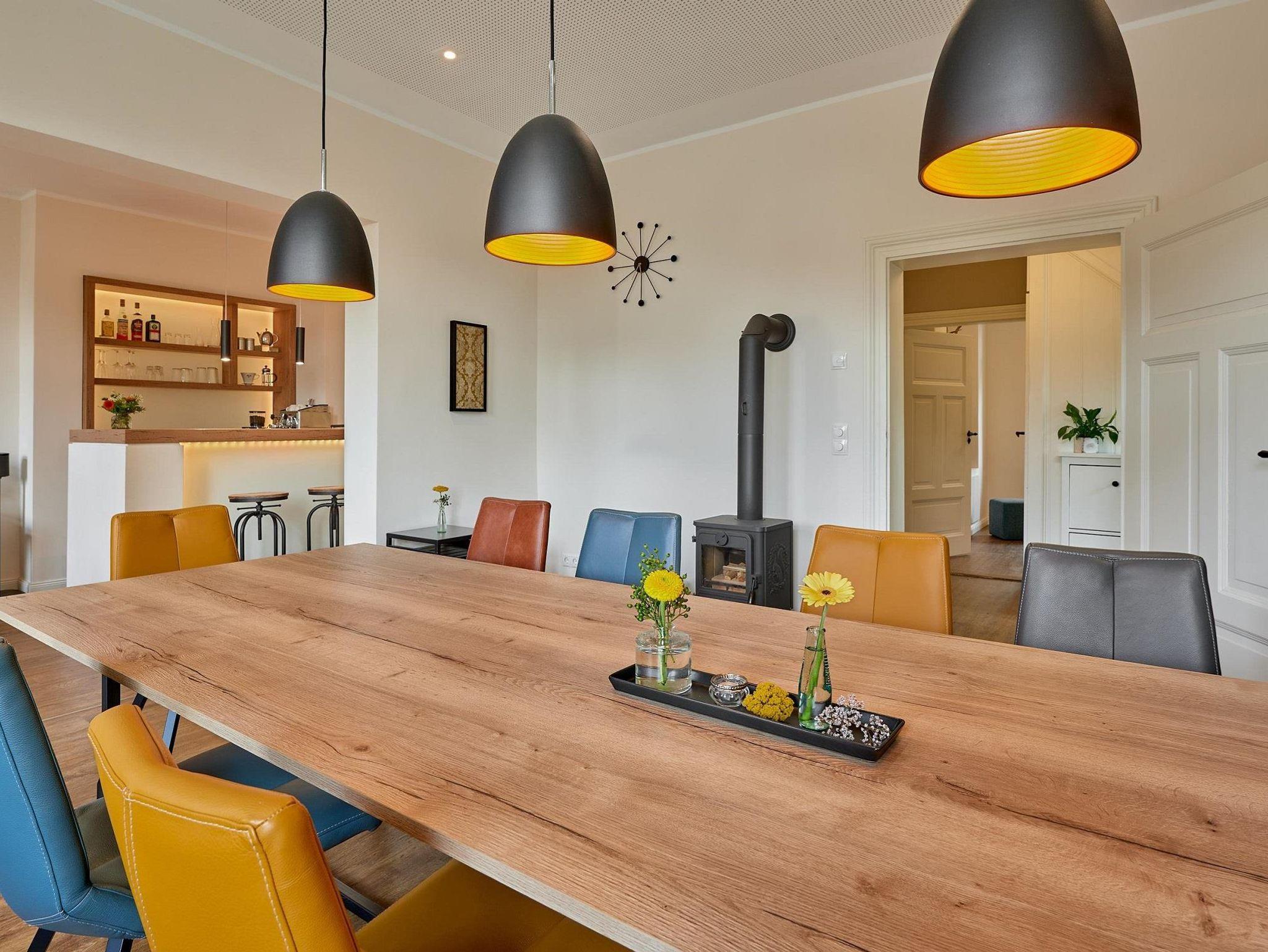 Die Café-Bar mit einer Siebträgermaschine und einem Lounge-Bereich steht in offener Verbindung zur Küche und zum Esszimmer, in dem bis zu 10 Personen an einem großen Tisch Platz finden. Hier steht auch ein gusseiserner Kaminofen für wohlige Wärme in der kalten Jahreszeit. Gegenüber dem Esszimmer befindet sich das Wohnzimmer mit einer großen Couch, einem Fernseher und Ausblick auf den Apfelbaum im Garten. An den Flur grenzt im Eingangsbereich ein kleines WC. Das Erdgeschoss ist komplett mit Sonos-Boxen ausgestattet. Für die Steuerung der Musik und einiger Hue-Leuchten steht ein iPad zur Verfügung – WLAN ist im gesamten Haus vorhanden und kann kostenfrei genutzt werden.