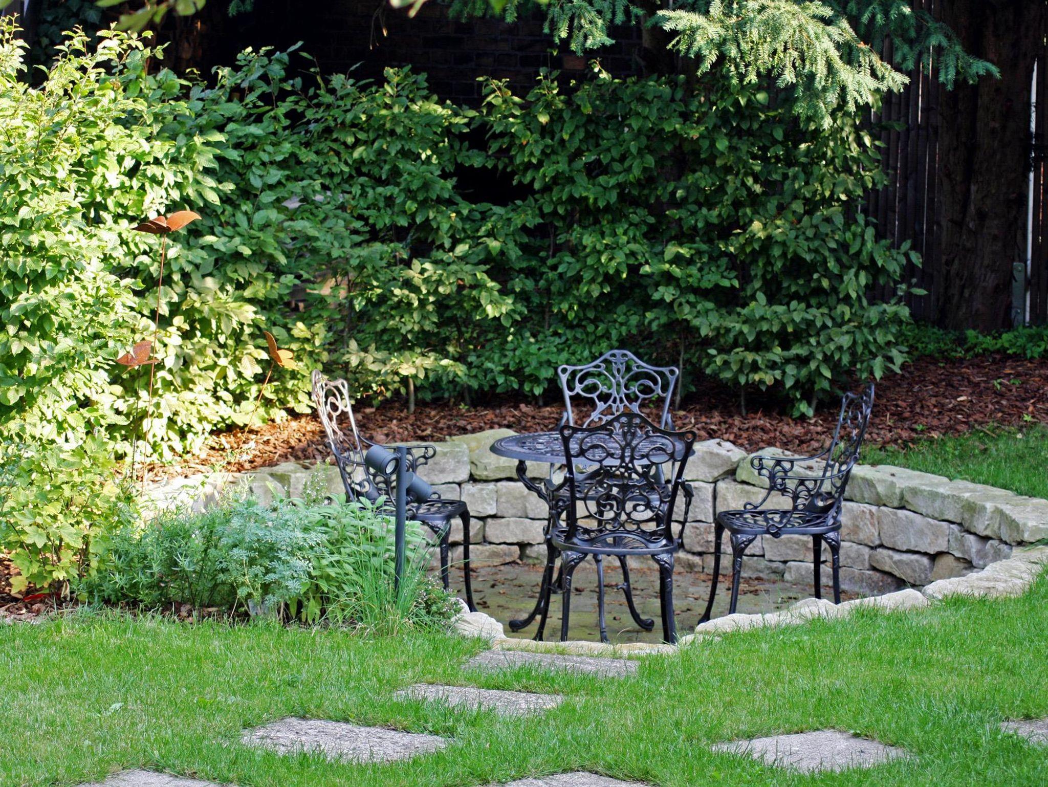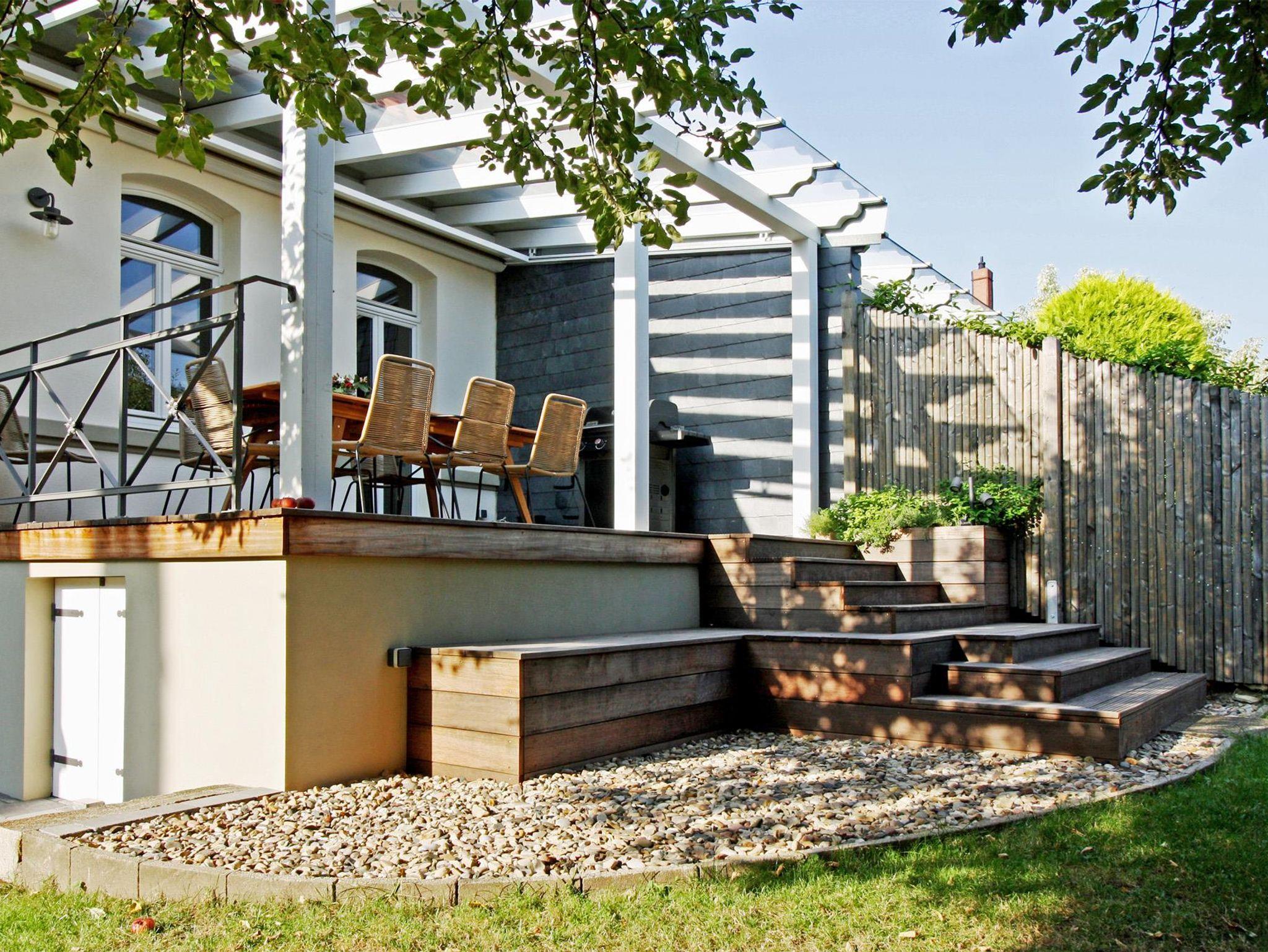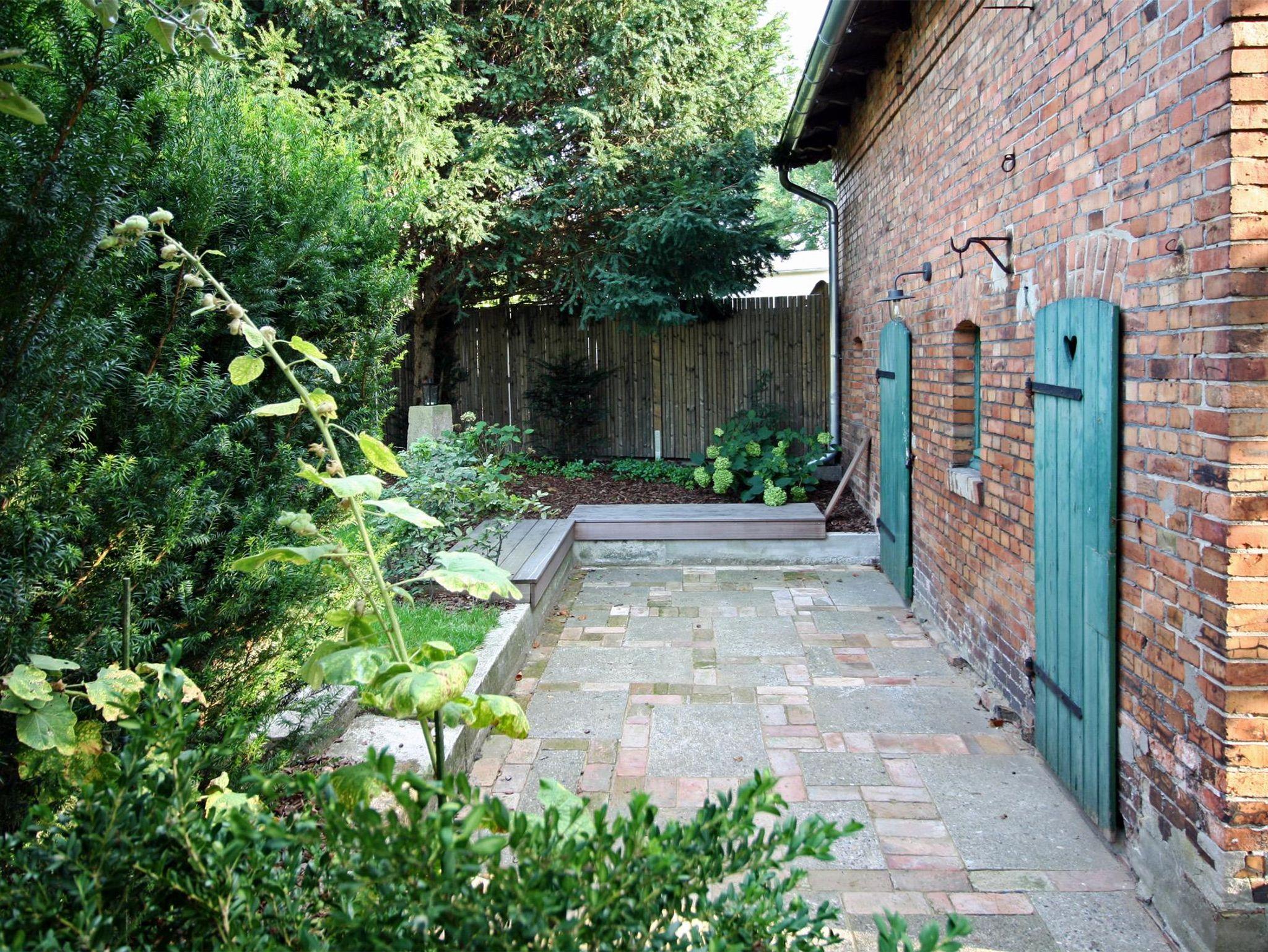 Von der großen Holzterrasse aus gelangt man über eine Freitreppe in den Garten sowie zur Sauna. An das Nebengebäude grenzt eine weitere Terrasse zum Aufenthalt im Garten. Im Schatten großer Eiben sind weitere Sitzgelegenheiten. Zwei Liegen laden zum Entspannen ein.
