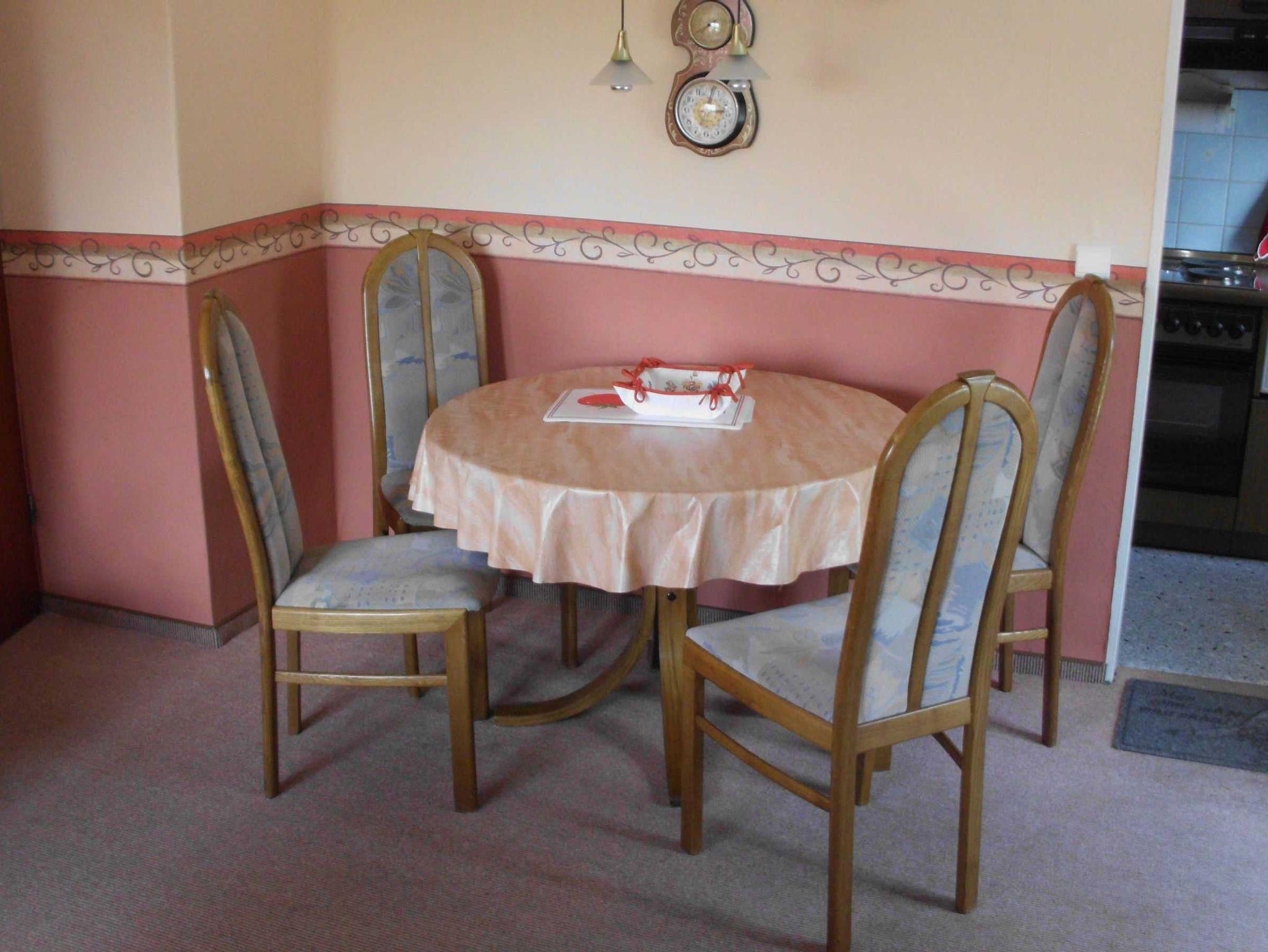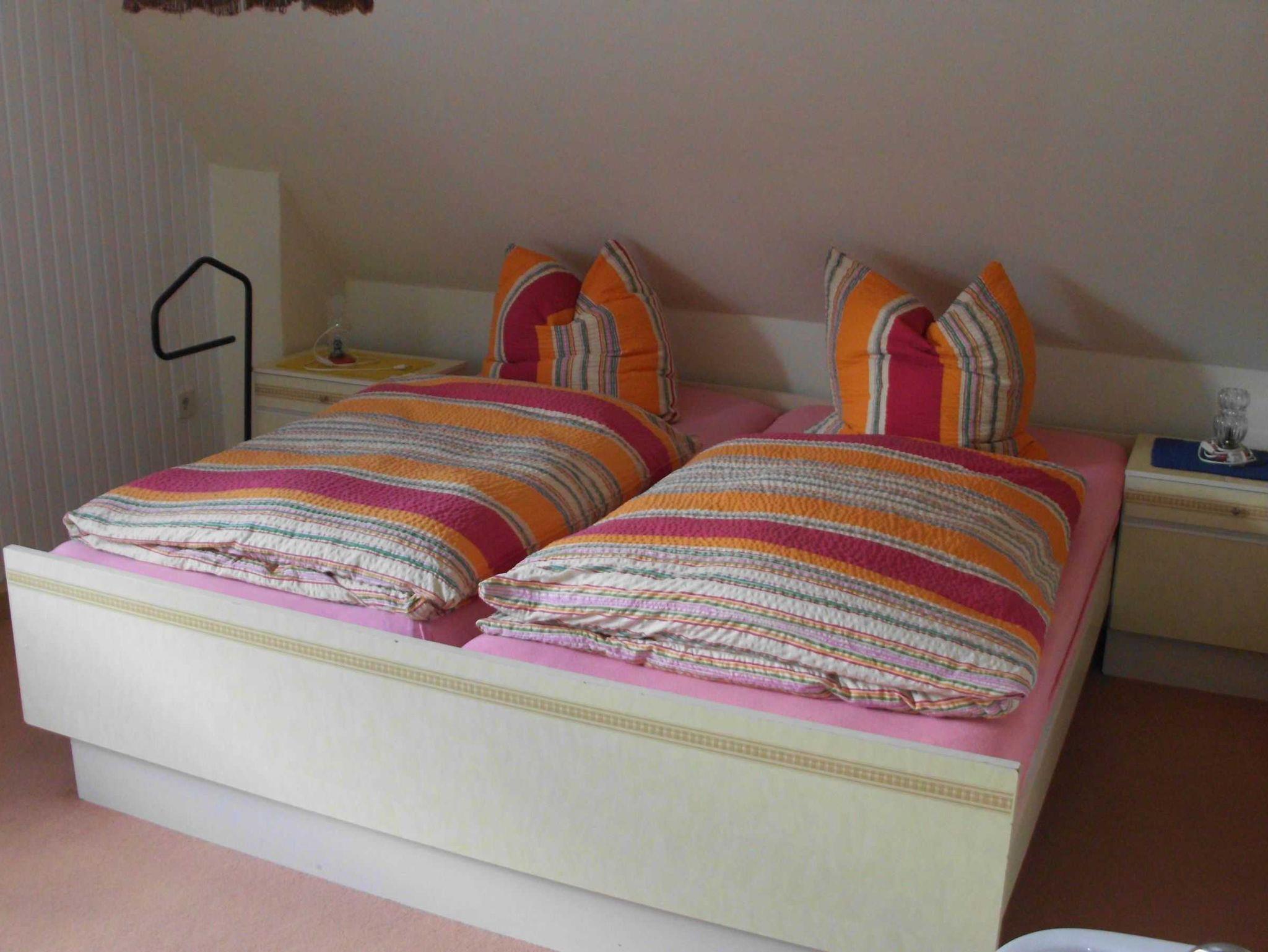 2 Schlafzimmer je 2 Betten. 1 Wohnraum mit Essecke, Sitzecke, TV und Radio; Balkon mit Gartenmöbeln; Die Küche ist vollständig eingerichtet mit Backofen, Mikrowelle usw.; Dusche/WC; Bettwäsche und Handtücher gegen Entgelt erhältlich; pro Bett einmalig 5,- Euro; Waschmaschine pro Waschgang 2,50 Euro; Stromkosten nach Verbrauch.