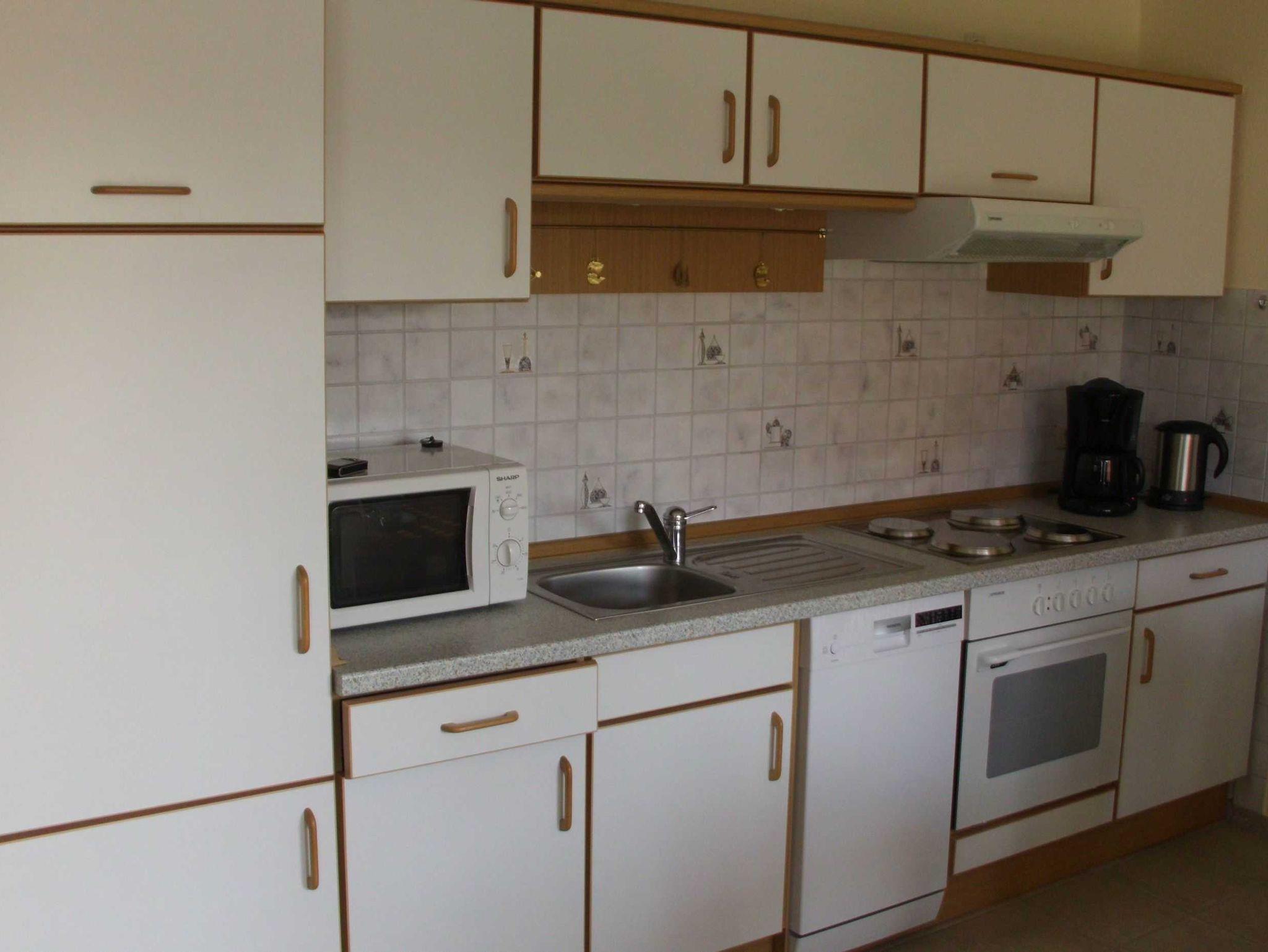eingerichtete Küche (E-Herd mit Backofen, Kühlschrank, Mikrowellengerät,