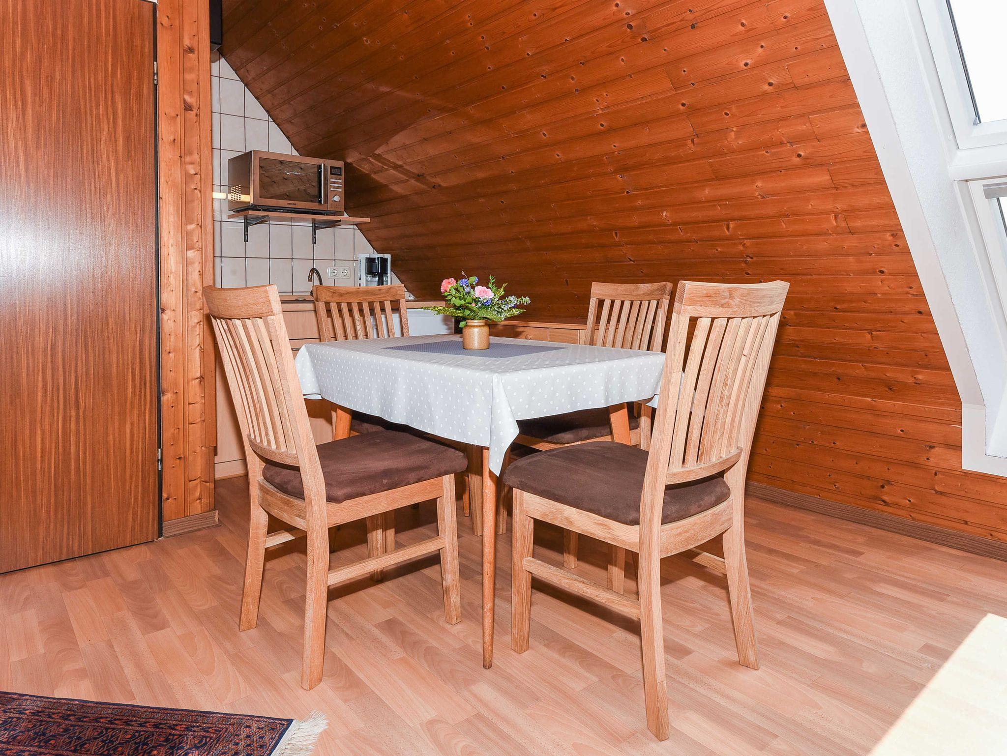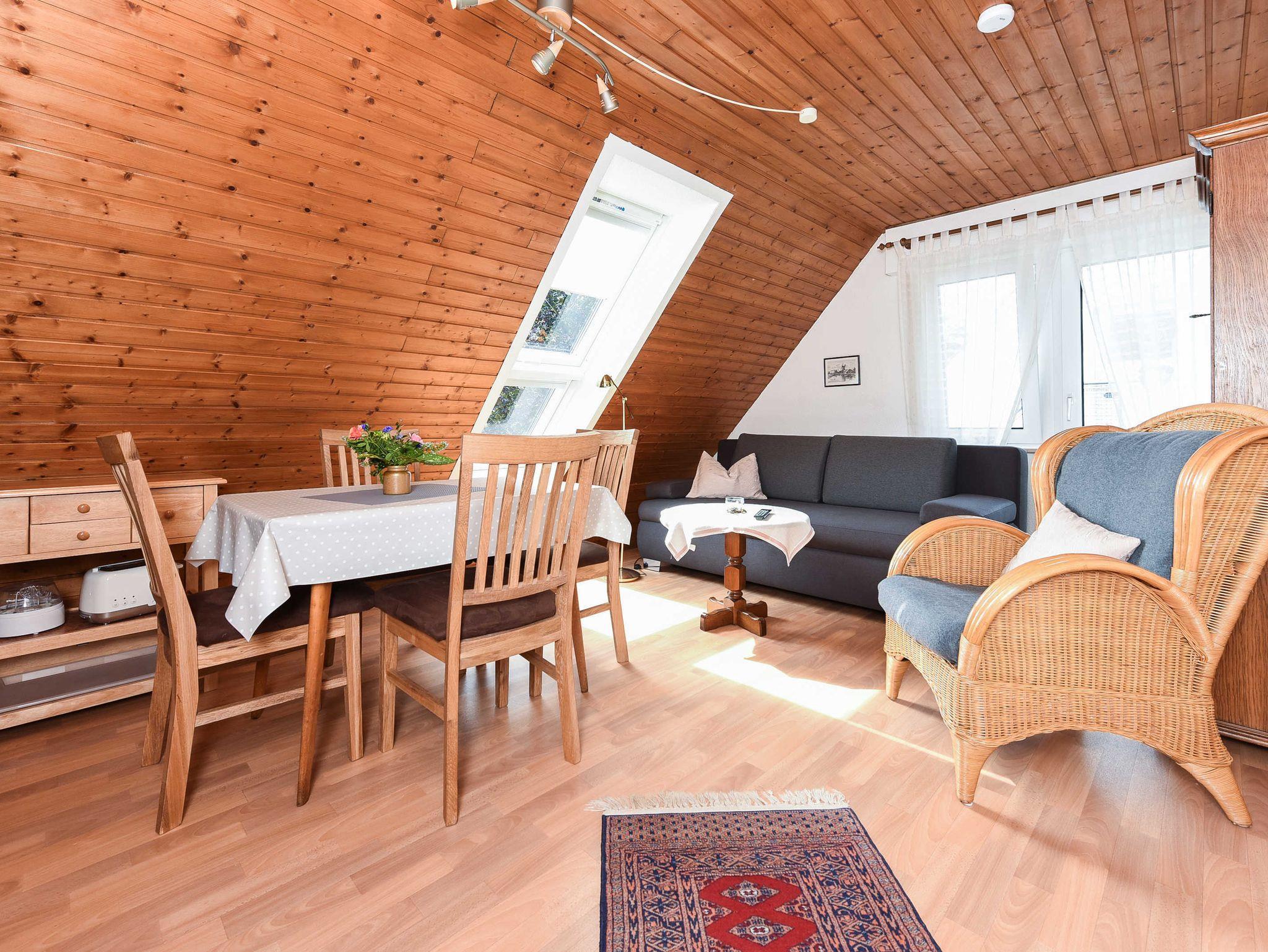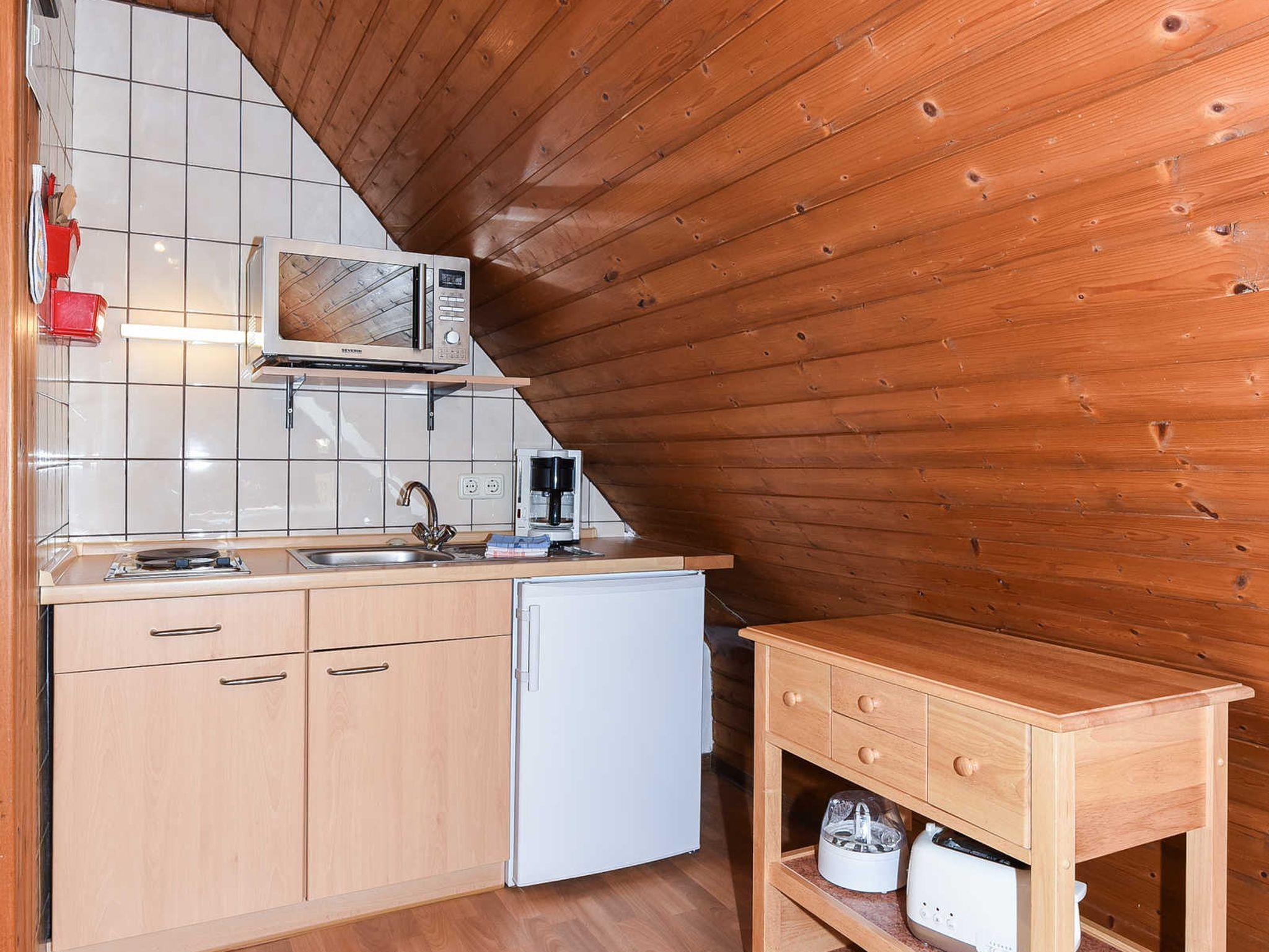 Größe ca. 41 Quadratmeter, Wohnraum mit integrierter Küche und Essgruppe, Schlafzimmer, Badezimmer mit Dusche, Waschtisch und WC, Obergeschoss, optimal für 2 bis 3 Personen und zusätzlich ein Kleinkind.