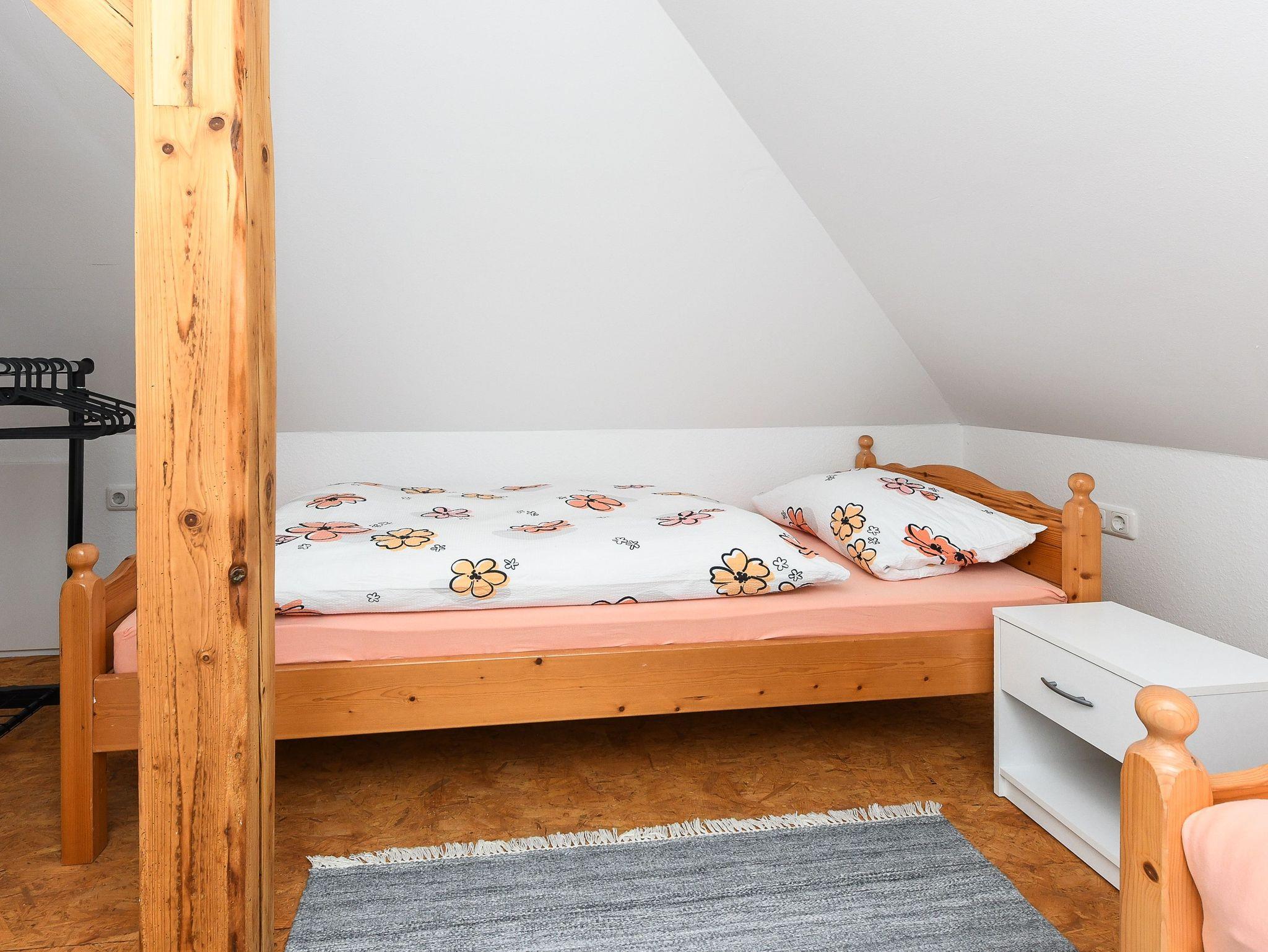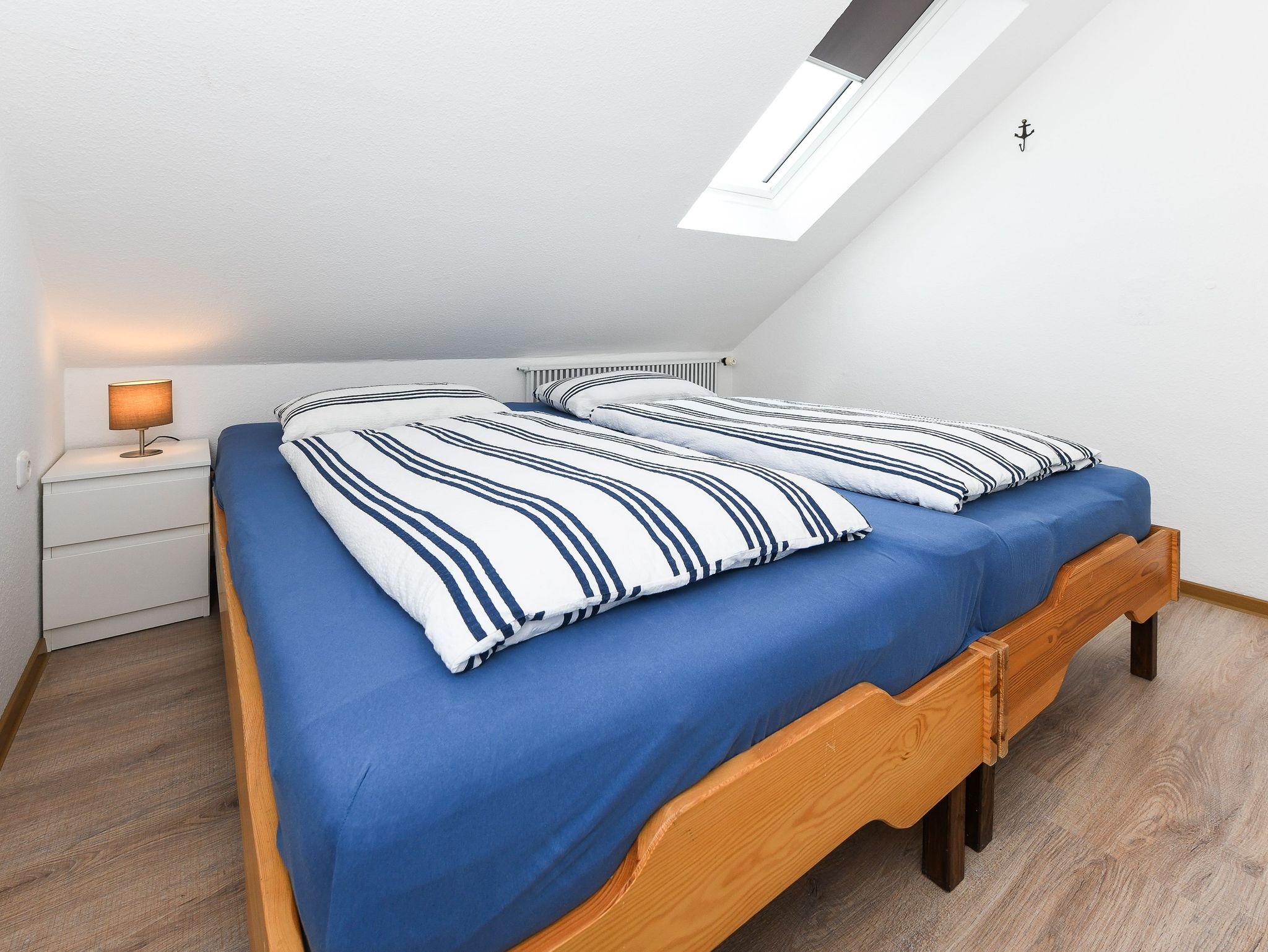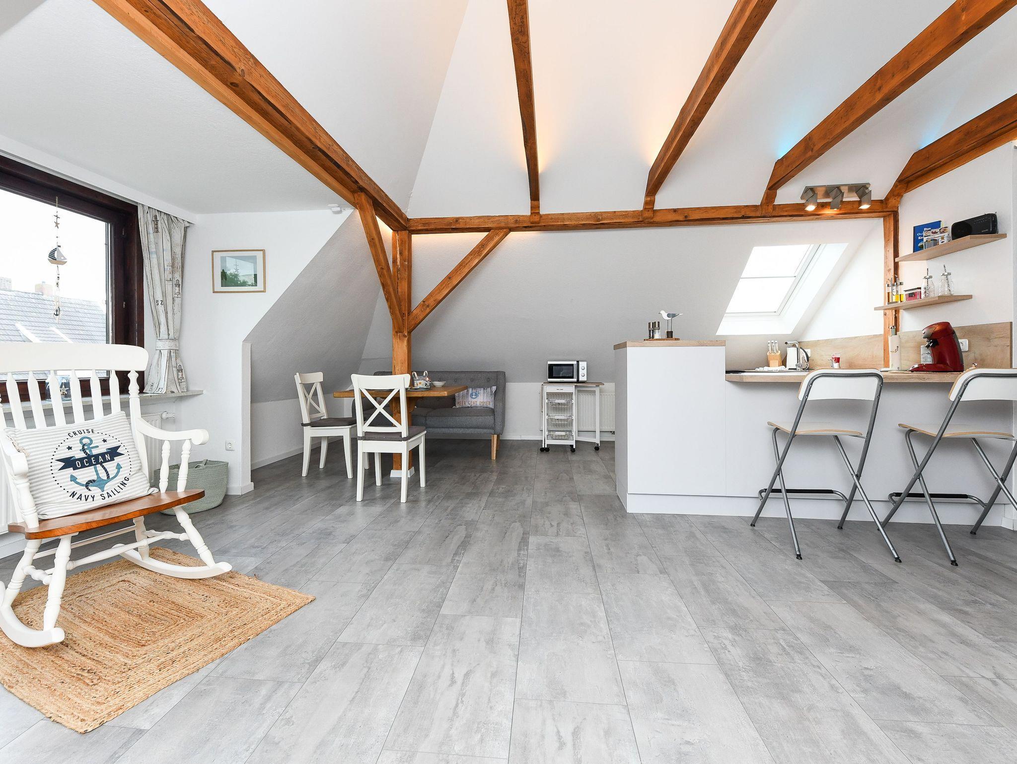 Wohnraum mit integrierter Küche, Schlafzimmer, zweites separates Schlafzimmer/Kinderzimmer, Badezimmer mit Dusche, Waschtisch und WC, Obergeschoss, überdachte Terrasse, Garten, Koffer-/Abstellraum, ausschließlich für Nichtraucher, optimal für 2 bis 4 Personen.
