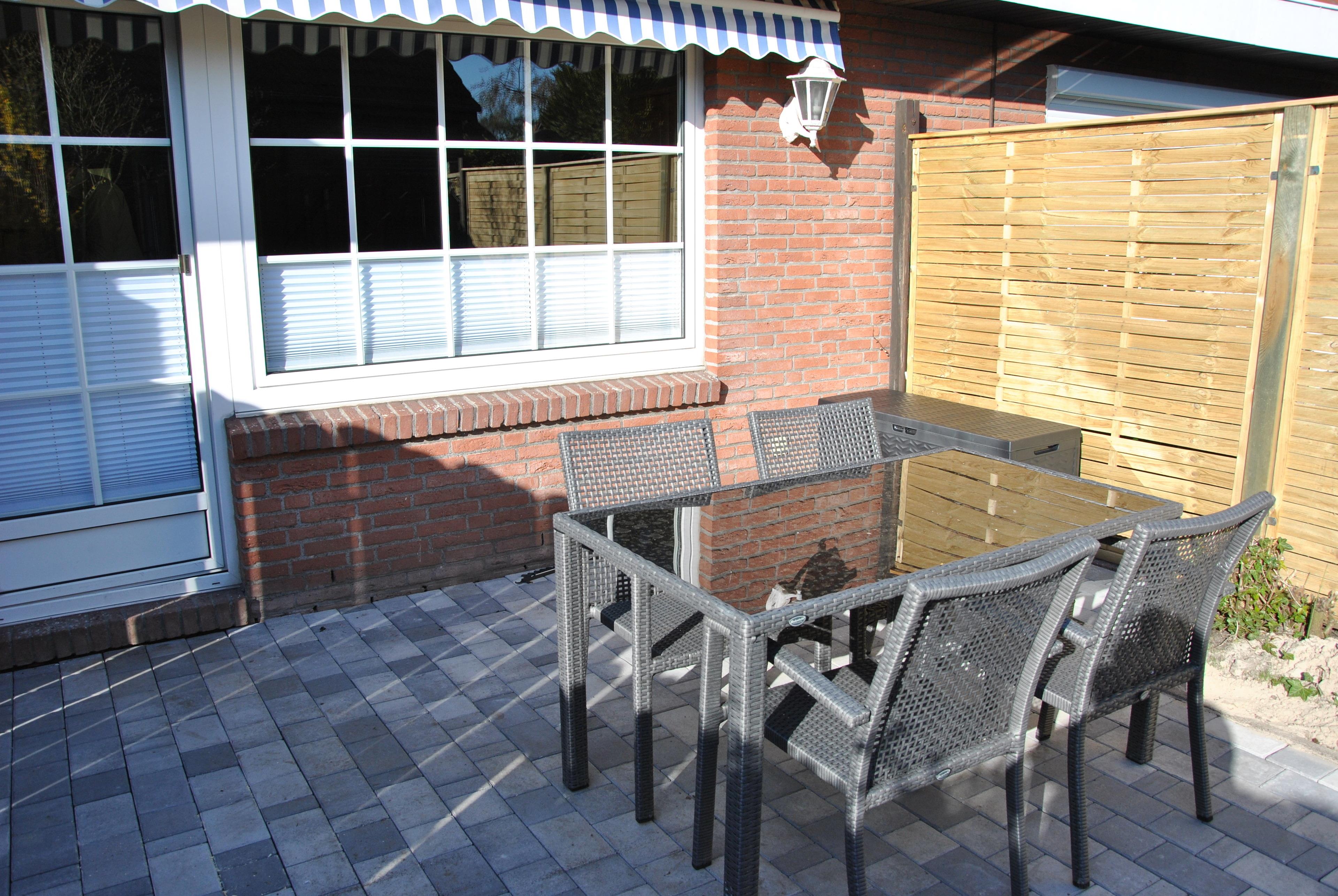 Vom Wohnzimmer aus gelangen Sie auf die zum Haus gehörige Terrasse. Die Terrasse hat eine Markise, die Sie bei Bedarf vor übermäßiger Sonneneinstrahlung schützt.