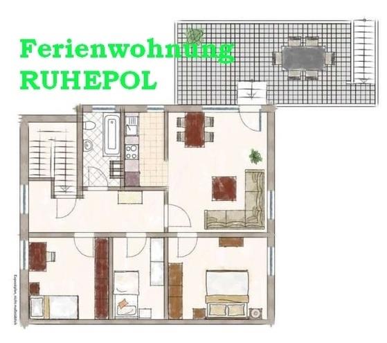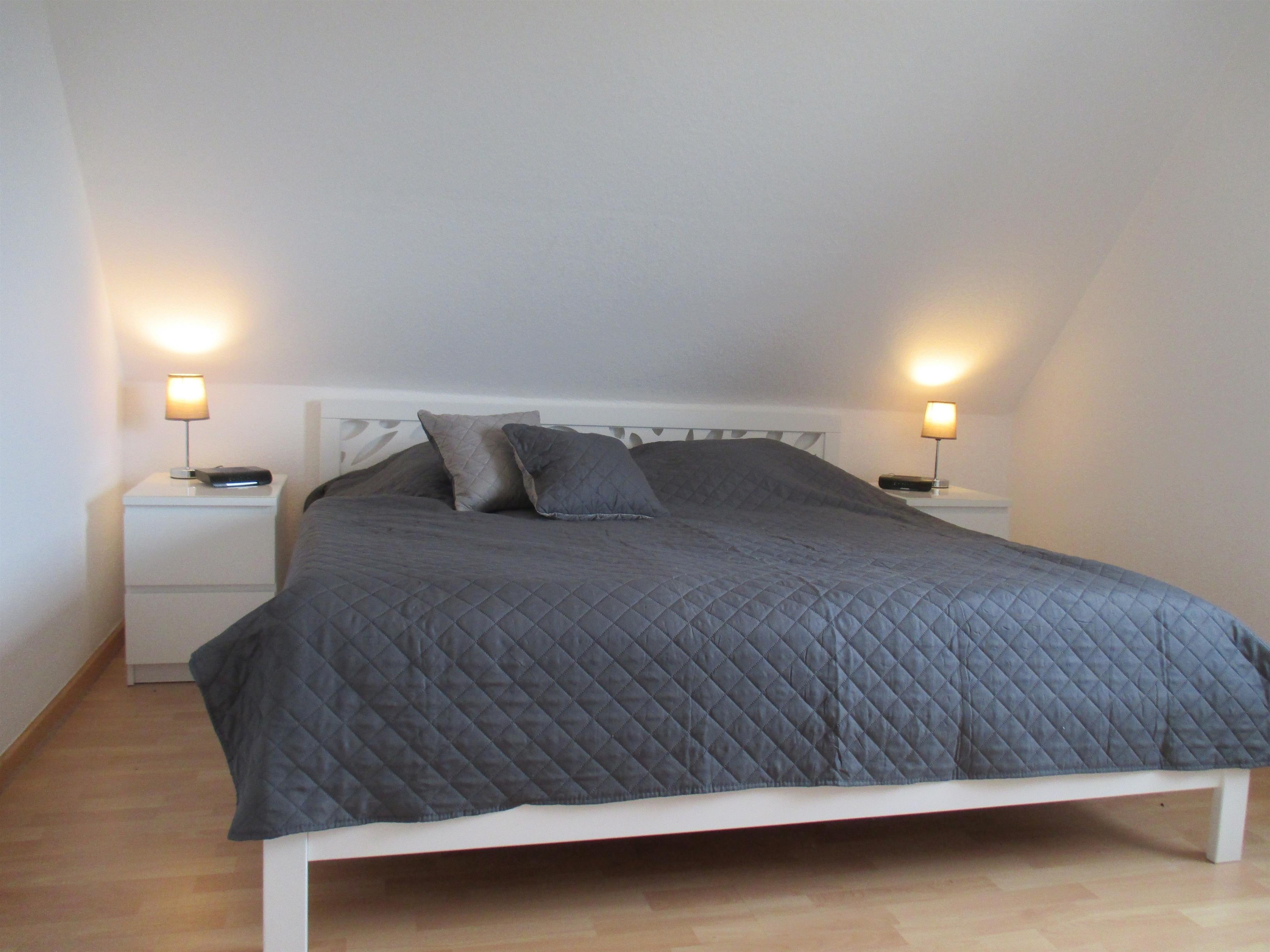 In dieser Fewo finden Sie einen Wohnraum mit Essecke, offener Küche und Zugang zum großen Balkon, 1 Tageslichtbad, 2 Schlafzimmer mit Doppelbetten sowie ein Schlafzimmer mit Einzelbett. Die lichtdurchflutete Wohnung ist gemütlich eingerichtet, so dass Sie sich vom ersten Urlaubstag an wohlfühlen können. Für Ihre Unterhaltung stehen SAT-TV, Musikanlage, CD-Radio, Bücher und Gesellschaftsspiele zur Verfügung. Der große Dachbalkon ist während der Gartensaison mit Tisch und Stühlen möbliert.