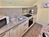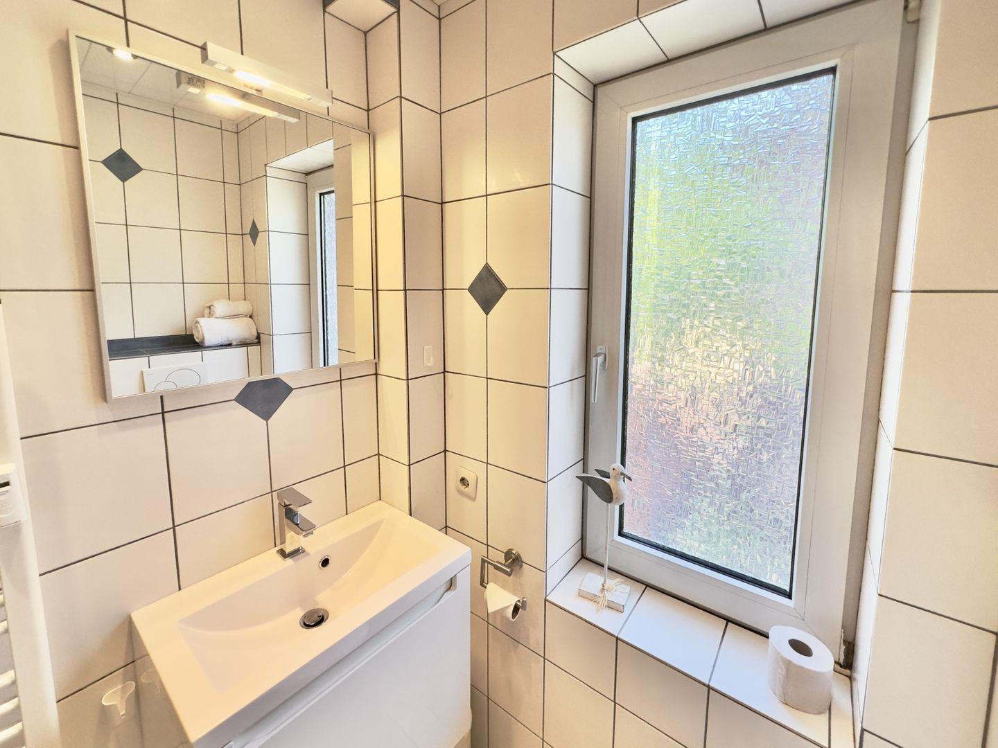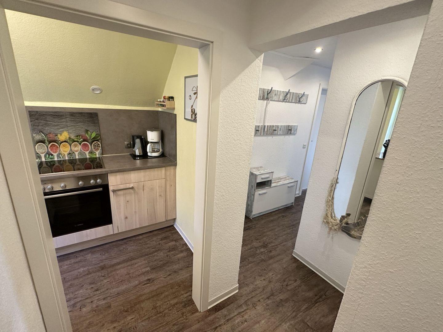 Das kleine Badezimmer im unteren Bereich der Wohnung ist freundlich und hell gefliest und bietet Ihnen alles, was Sie für Ihre tägliche Hygiene benötigen. Die angrenzende Küche ist komplett ausgestattet und lädt dazu ein, kulinarische Köstlichkeiten zuzubereiten.