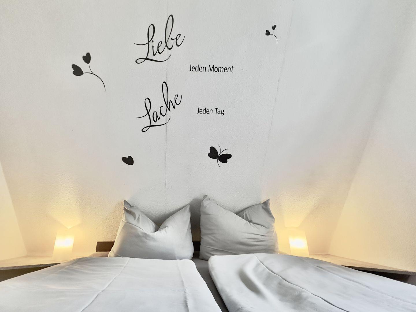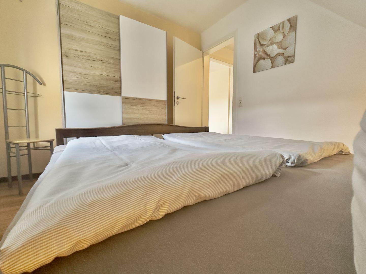 Das Schlafzimmer auf der unteren Etage bietet mit seinem gemütlichen Doppelbett und großzügigem Kleiderschrank ausreichend Platz für zwei Personen. Über eine steile Holztreppe gelangen Sie in das Dachgeschoss, wo ein weiteres Schlafzimmer auf Sie wartet. Die schrägen Wände verleihen diesem Raum eine besonders behagliche Atmosphäre, ideal für erholsame Nächte.