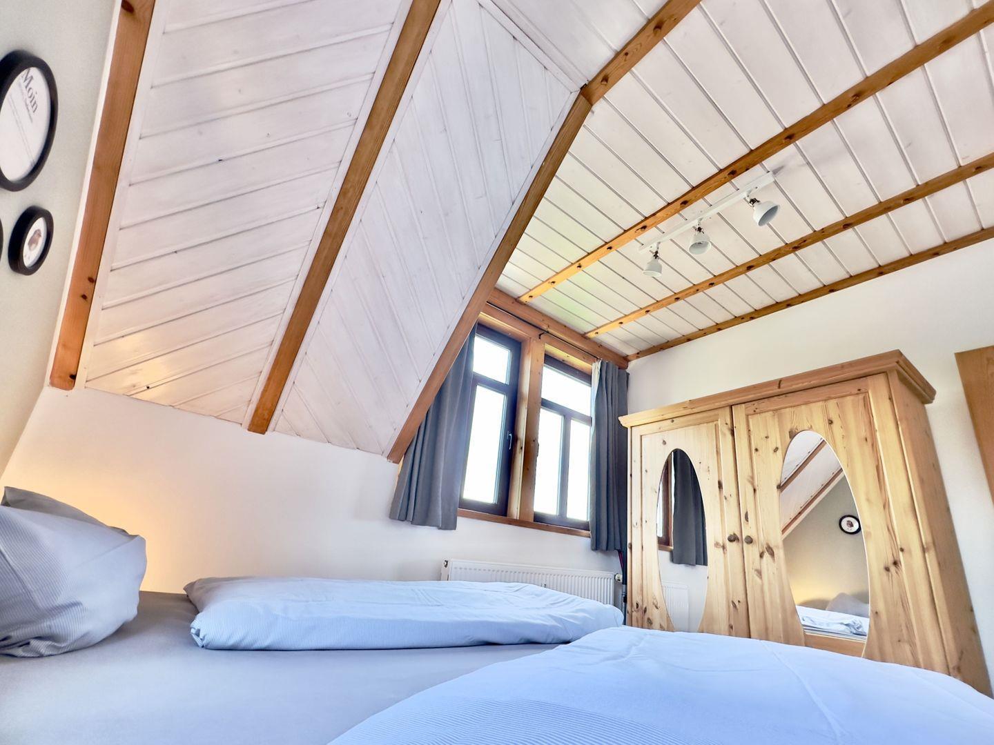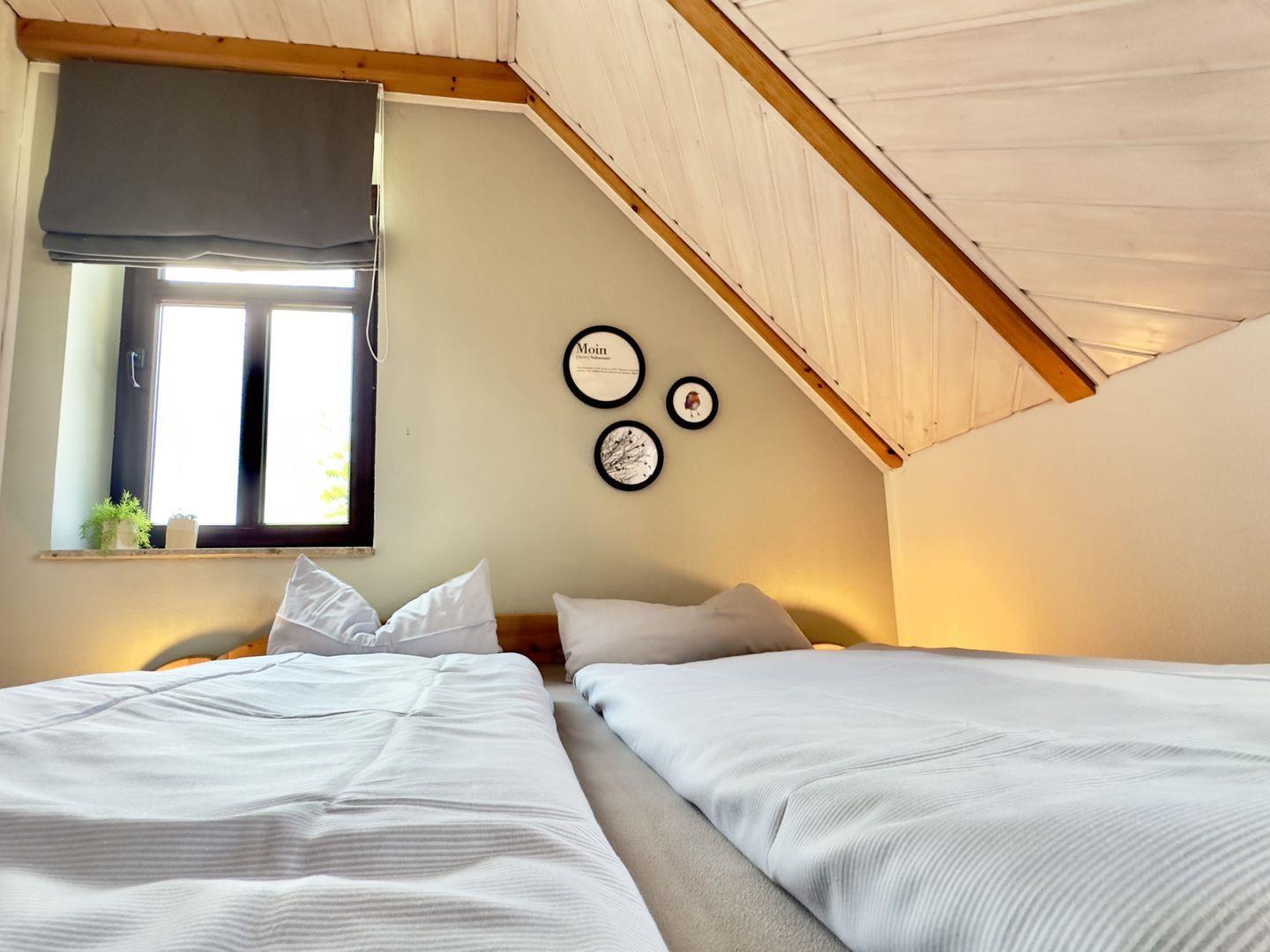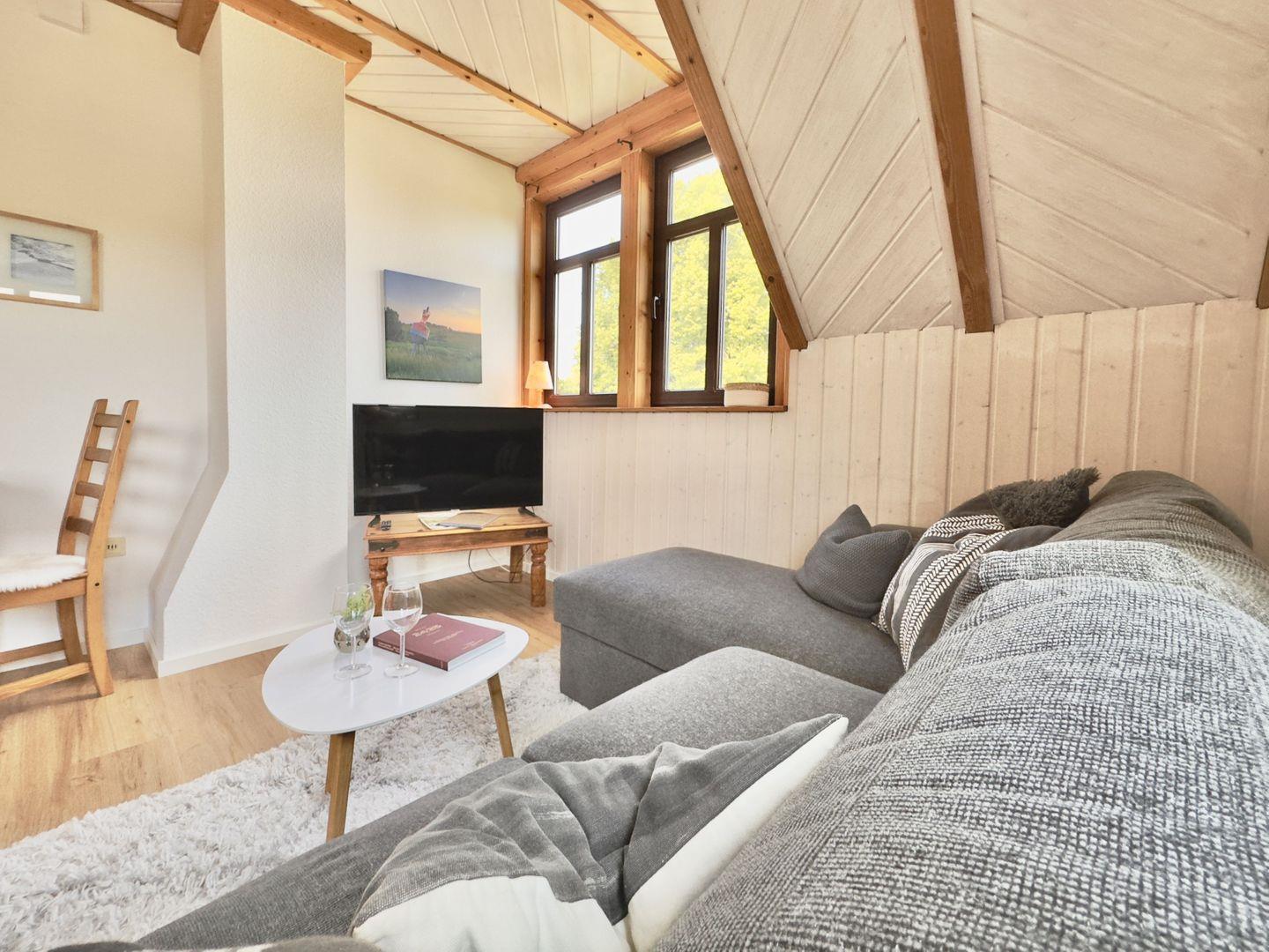Über eine stabile Holztreppe erreichen Sie Ihr Feriendomizil im ersten Obergeschoss. Schon beim Eintreten empfängt Sie ein helles, offenes Wohnkonzept mit liebevollen Details und viel natürlichem Licht.