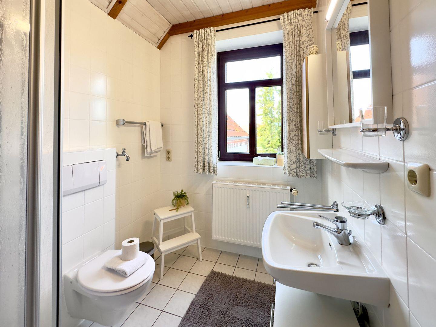 Das moderne Tageslichtbad mit geräumiger Dusche rundet das komfortable Gesamtbild ab.