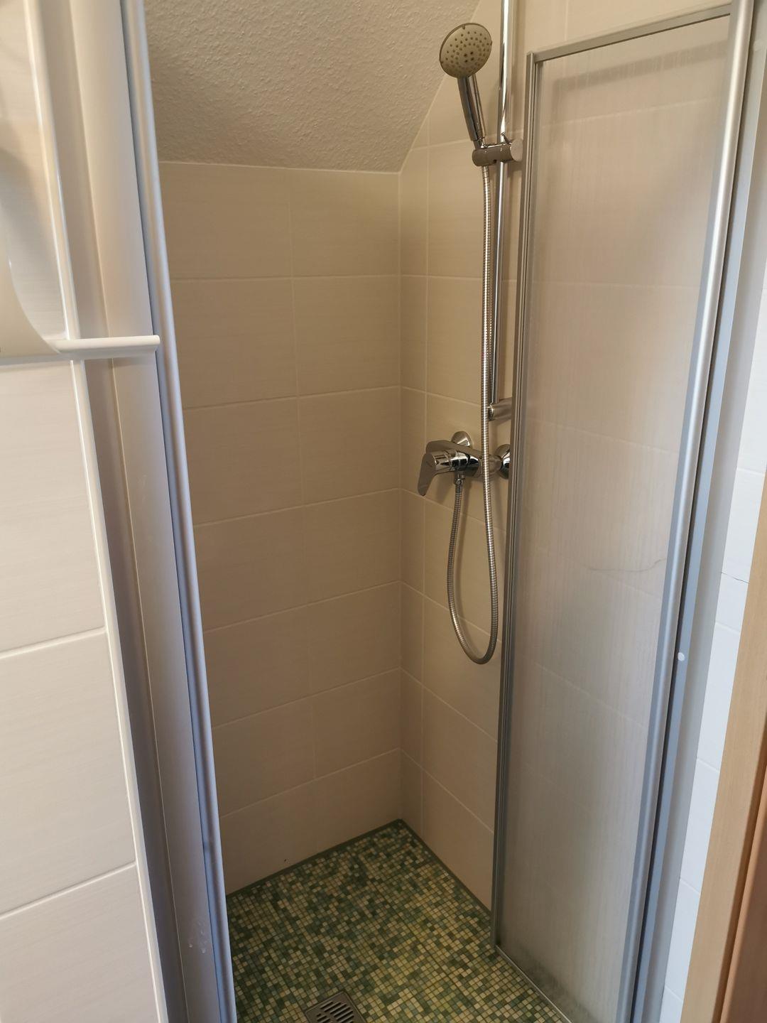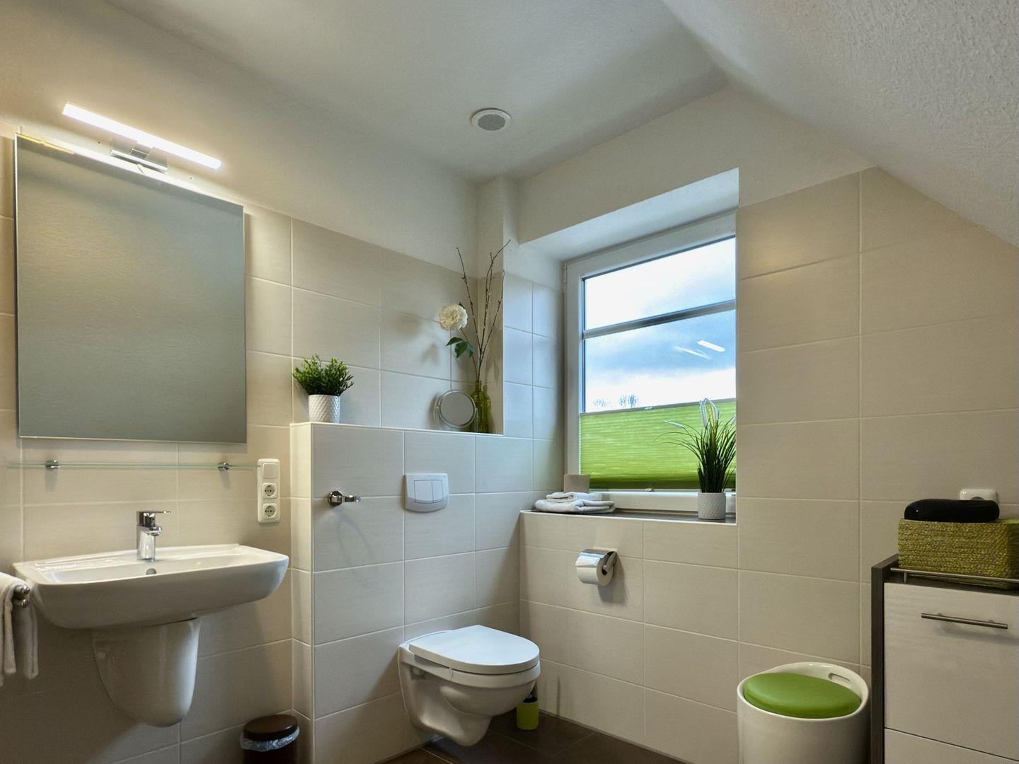 Das Tageslichtbad verfügt über eine geräumige Dusche sowie einen Wandspiegel und Kosmetikspiegel.