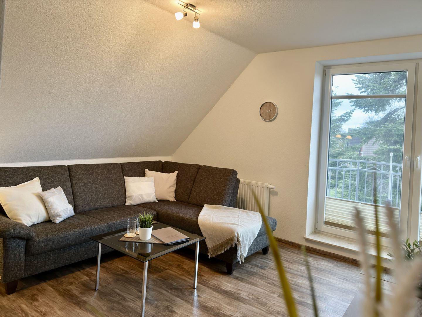 Die Ferienunterkunft befindet sich in der 1. Etage. Der offene Wohn- und Küchenbereich ist durch die Fensterfront lichtdurchflutet. Ein gemütliches Sofa sowie die sich im Wohnzimmer befindende Essgruppe laden zum gemütlichen Entspannen ein.