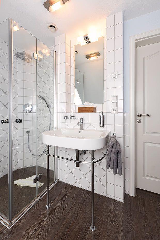 Das helle Tageslichtbad ist in moderner weißer Bandkeramik gehalten. Es verfügt über eine Badewanne, eine bodengleiche Duschkabine mit Regendusche und Glastüren sowie eine eigene Sauna, in der 4 Personen Platz finden.