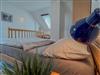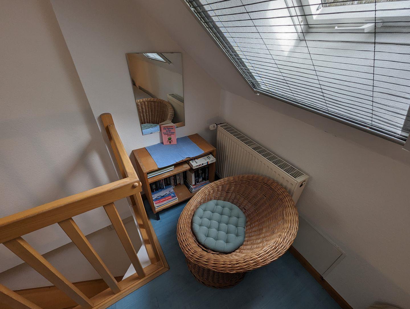 Über eine Holztreppe gelangen Sie in die Schlafgalerie im Dachgeschoss. Diese bietet mit einem 90 cm und einem 140 cm breiten Bett ausreichend Platz für erholsame Nächte. Ein Kleiderschrank und kleine Möbelstücke sorgen für eine angenehme Atmosphäre.