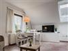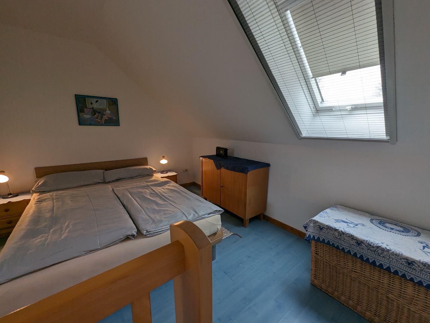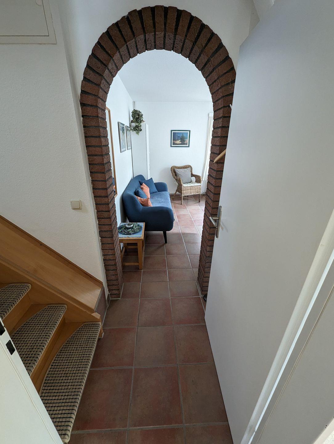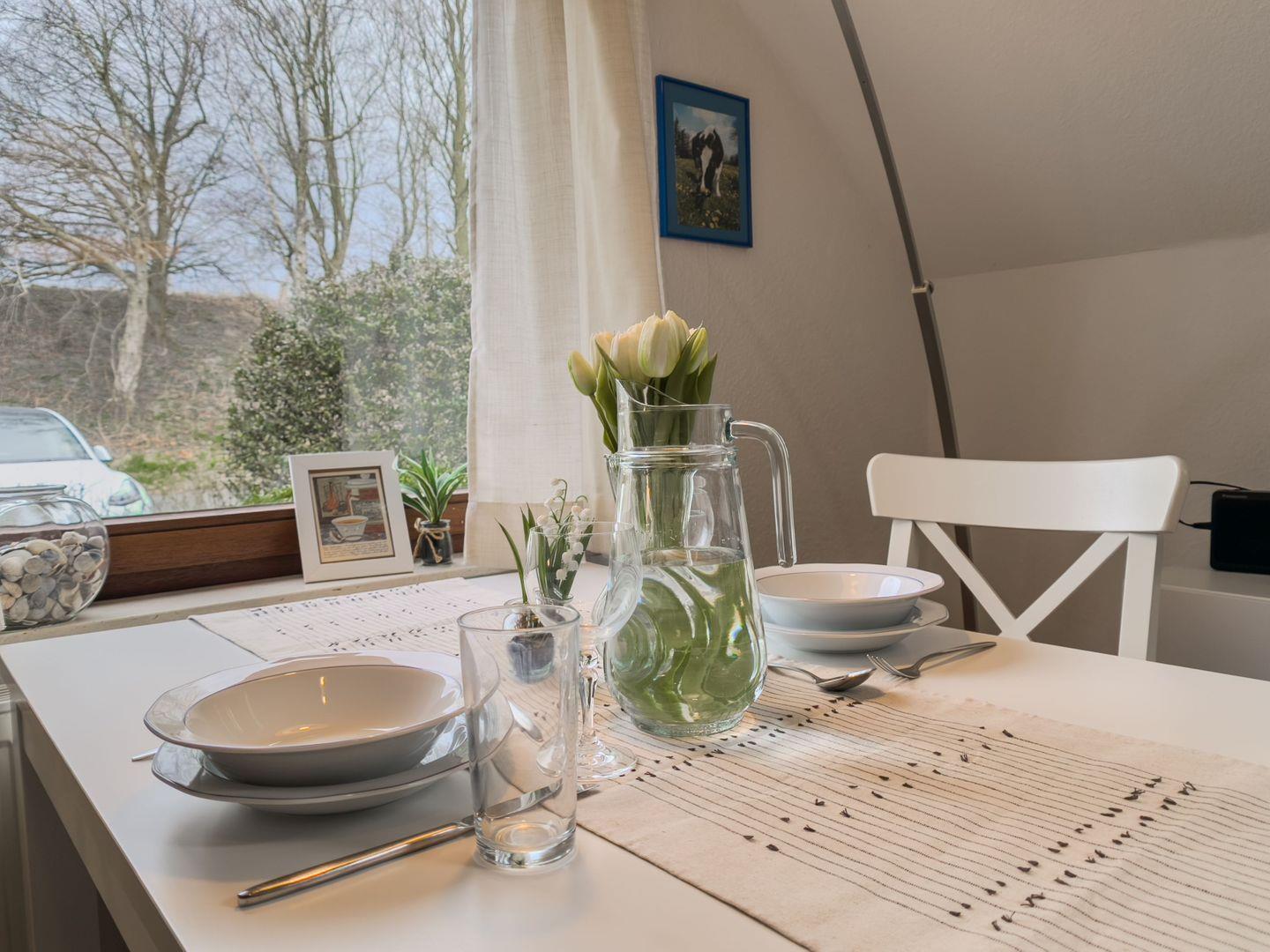 Im Erdgeschoss finden Sie den einladenden Wohnbereich mit einer gemütlichen Küchenzeile, die perfekt ausgestattet ist, um Ihre eigenen Mahlzeiten zuzubereiten. Hier können Sie gemeinsame Abende mit der Familie oder Freunden verbringen, während das Sofa und der Esstisch für gesellige Stunden sorgen. Zwei Fenster sorgen für viel Tageslicht, und eines davon bietet Ihnen den wunderbaren Deichblick, der das ganze Ambiente noch besonderer macht.