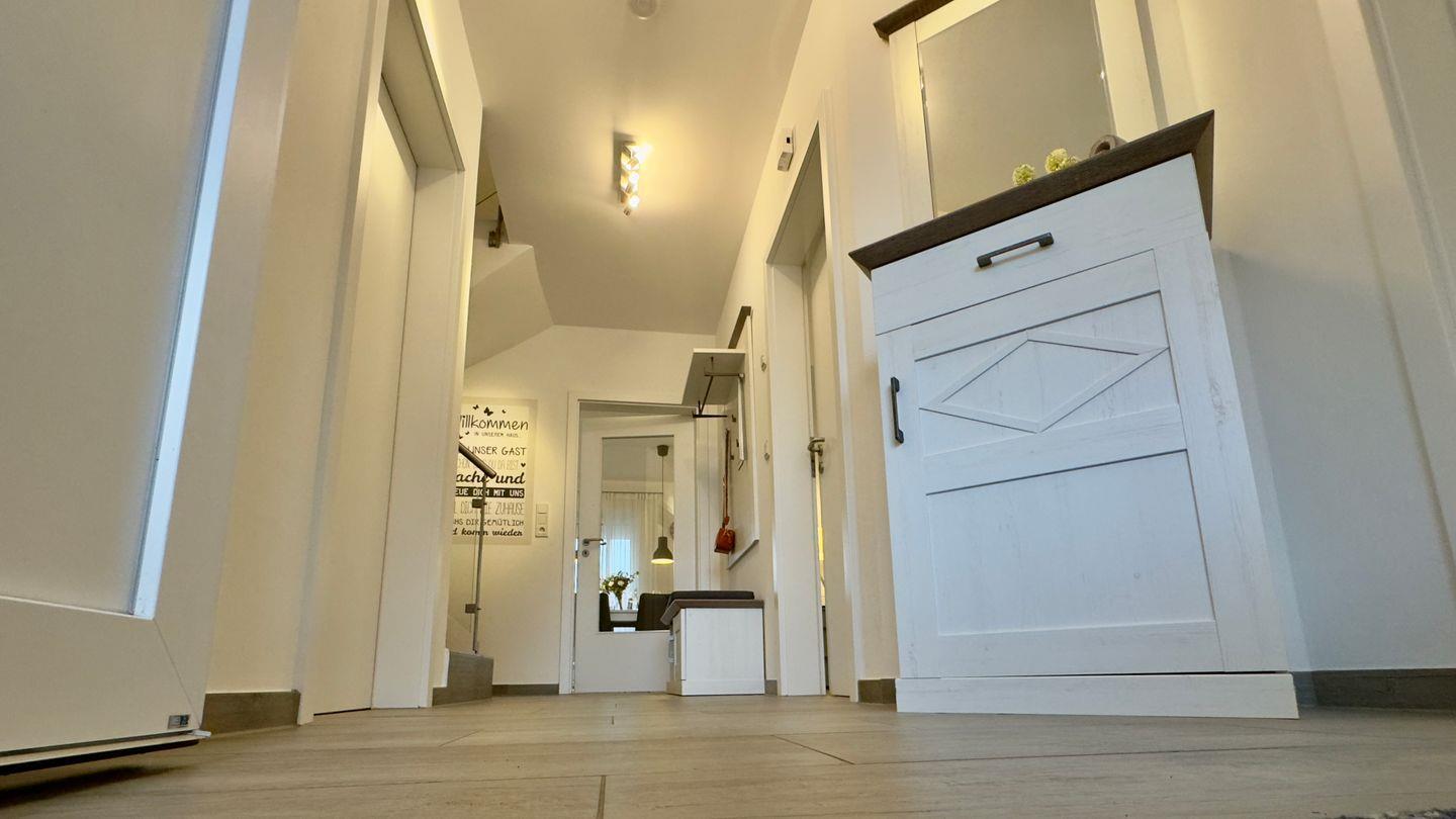 Bereits beim Betreten des Hauses empfangen Sie warme Naturtöne, die für ein wohliges Ambiente sorgen. Der einladende Flur mit Garderobe und Schuhschrank bietet genügend Stauraum für Jacken und Gepäck. Das angrenzende, lichtdurchflutete Wohnzimmer mit gemütlichem Sofa lädt zum Entspannen ein, während der Essbereich ausreichend Platz für gemeinsame Mahlzeiten oder Spieleabende bietet.