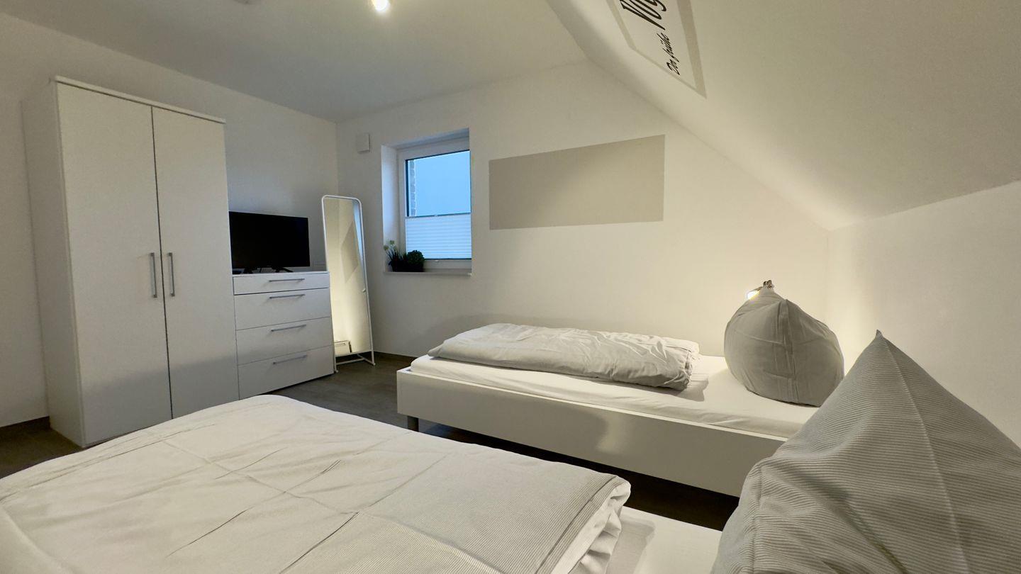 Über die massive Steintreppe gelangen Sie ins Obergeschoss. Hier erwarten Sie zwei weitere Schlafzimmer: eines mit einem komfortablen Boxspringbett (2x2 m), das andere mit zwei Einzelbetten – perfekt für Kinder oder weitere Gäste. Auch auf dieser Etage steht Ihnen ein modernes Tageslichtbad mit ebenerdiger Dusche zur Verfügung.