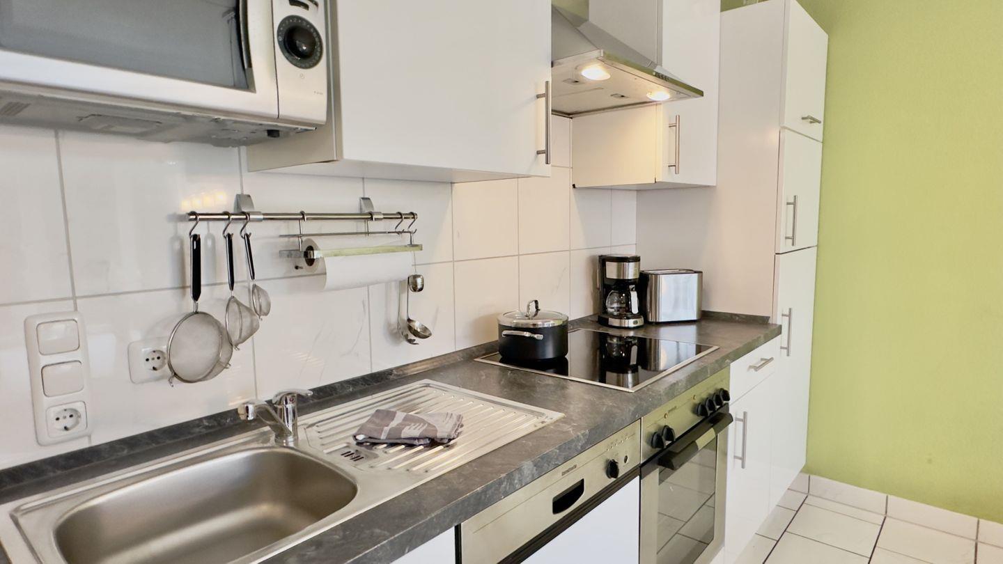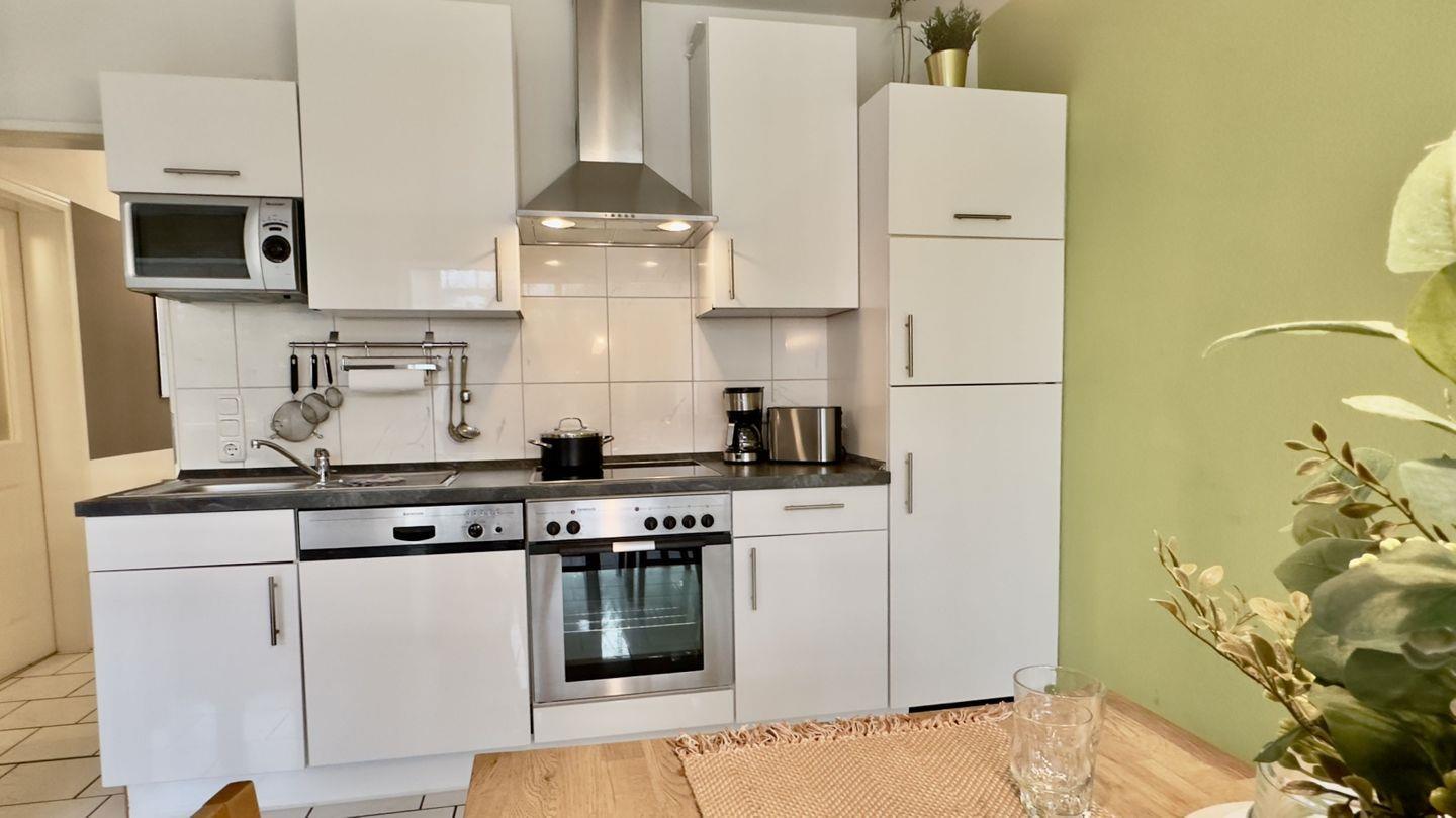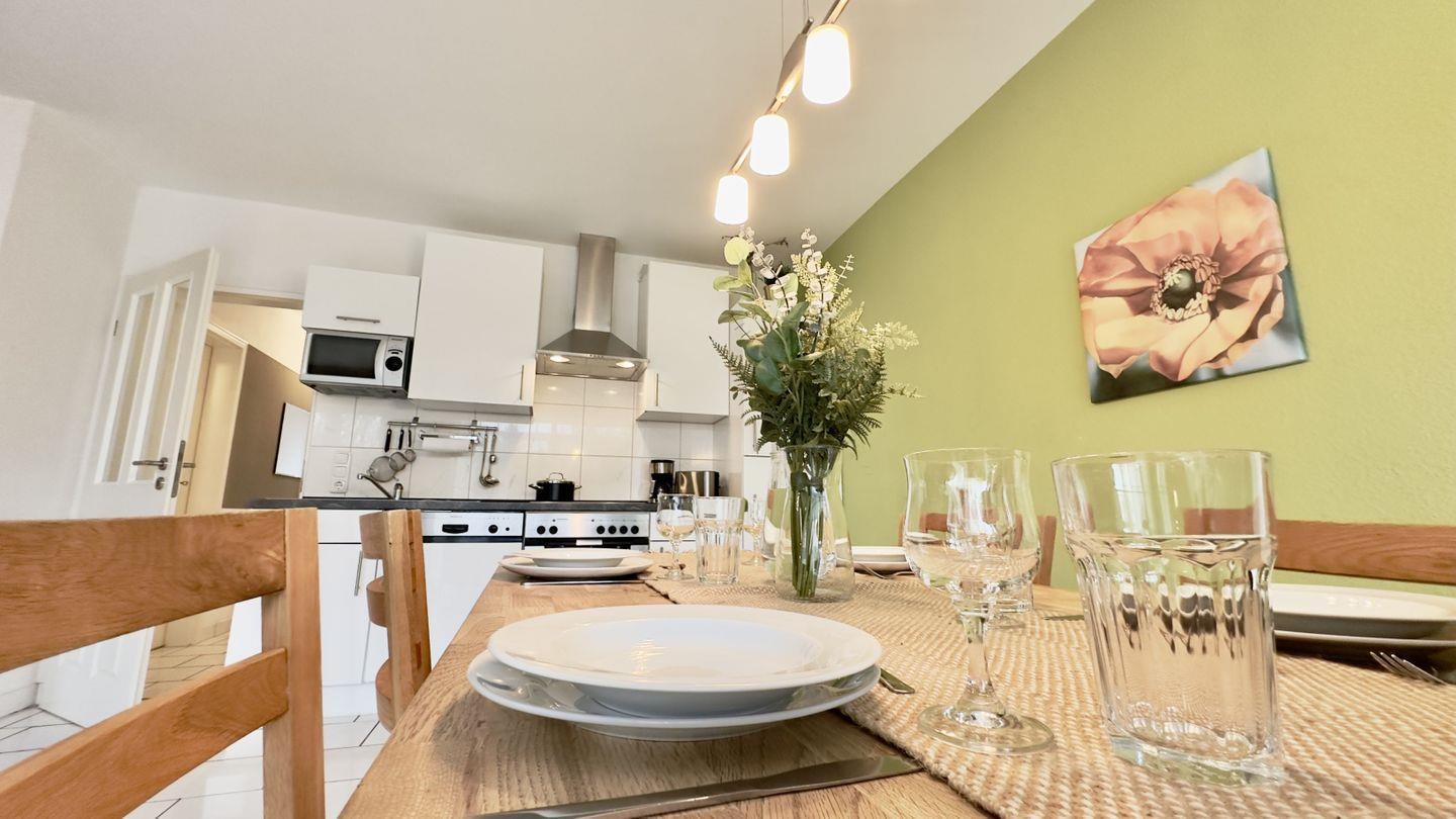 Die integrierte Küche ist voll ausgestattet – alles, was Sie für eine gelungene Selbstversorgung benötigen, finden Sie hier. Direkt daneben bietet die einladende Essgruppe ausreichend Platz für gemeinsame Mahlzeiten oder fröhliche Spieleabende mit Ihren Liebsten.