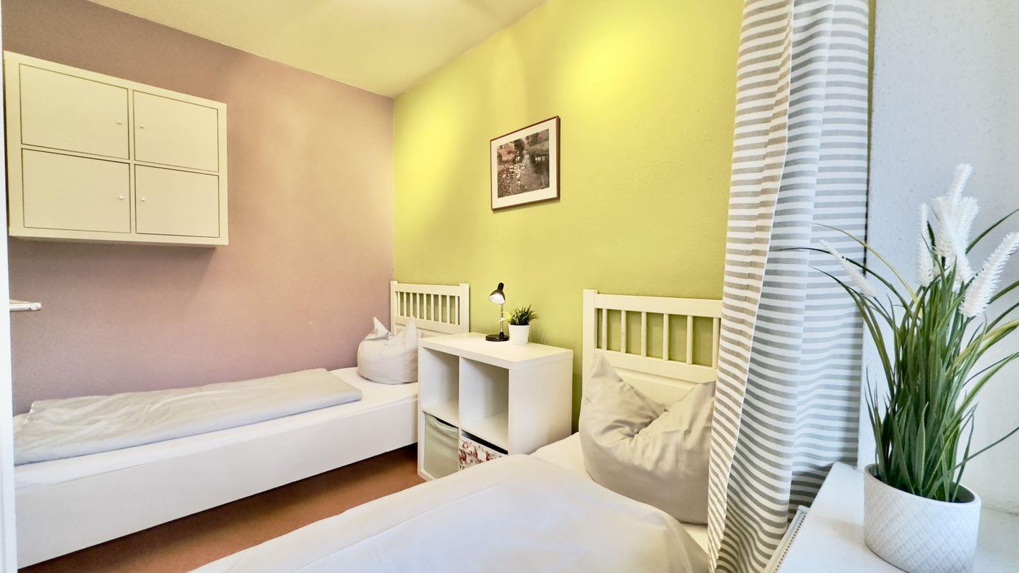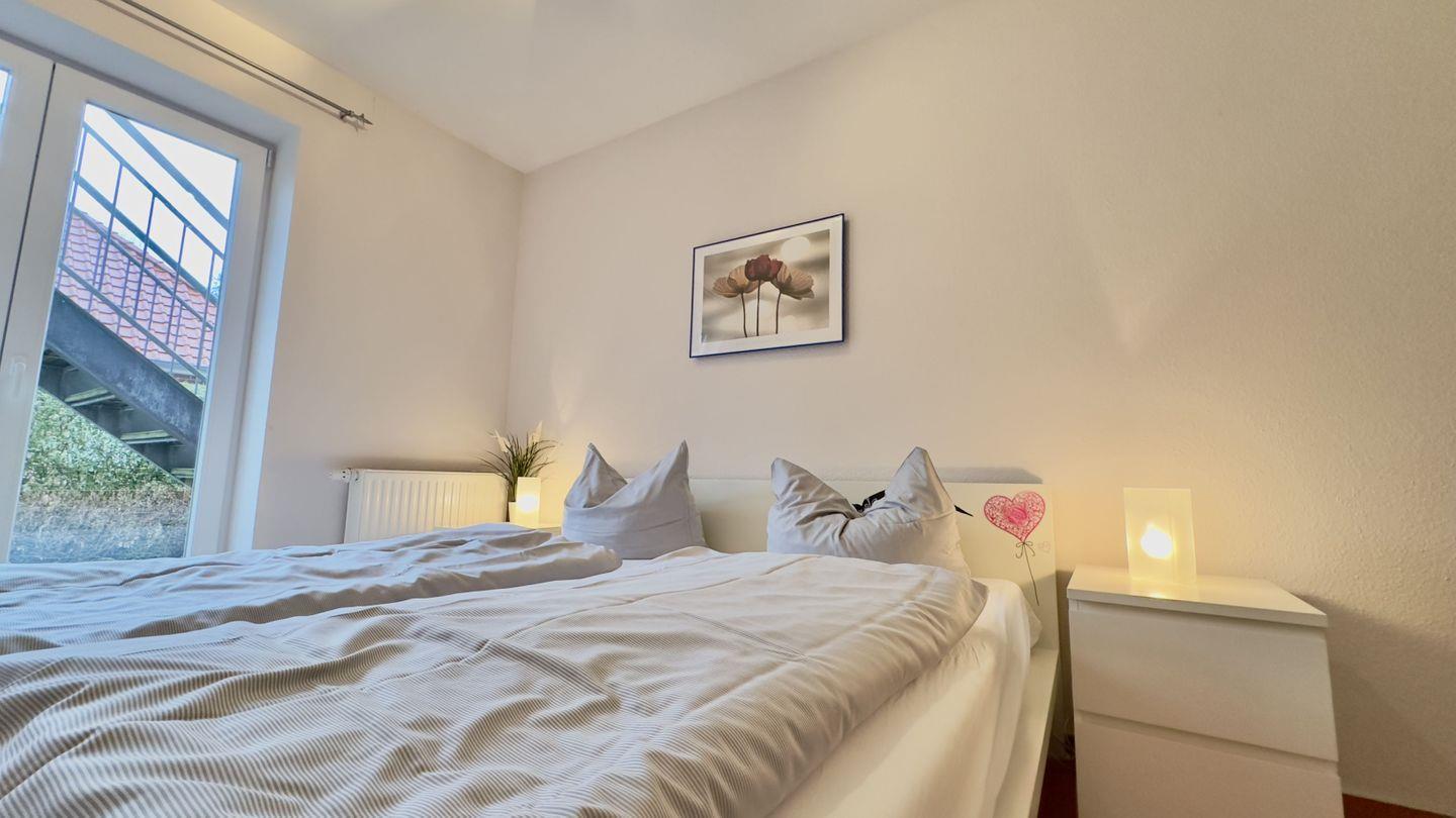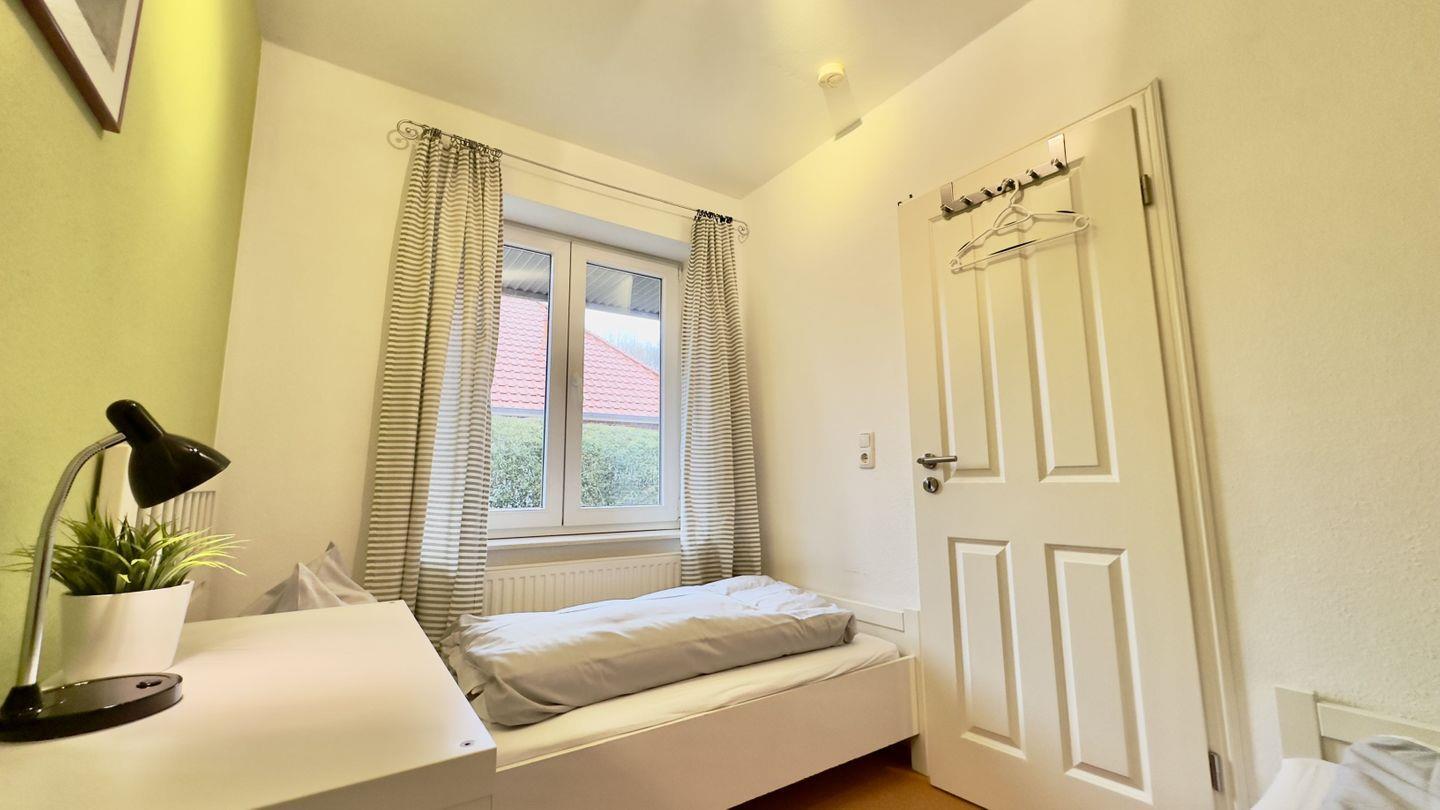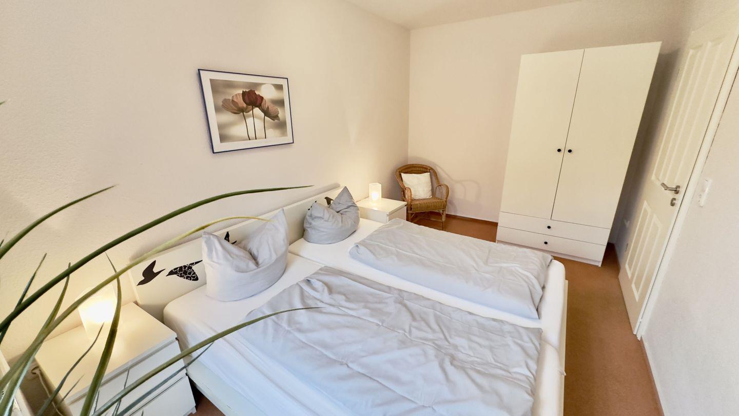 Das gemütliche Schlafzimmer ist mit einem Holzdoppelbett und einem geräumigen Kleiderschrank ausgestattet, der genügend Platz für Ihre Urlaubsgarderobe bietet. Im gegenüberliegenden Schlafzimmer finden zwei weitere Personen Platz in bequemen Einzelbetten – ideal für Kinder oder Freunde.