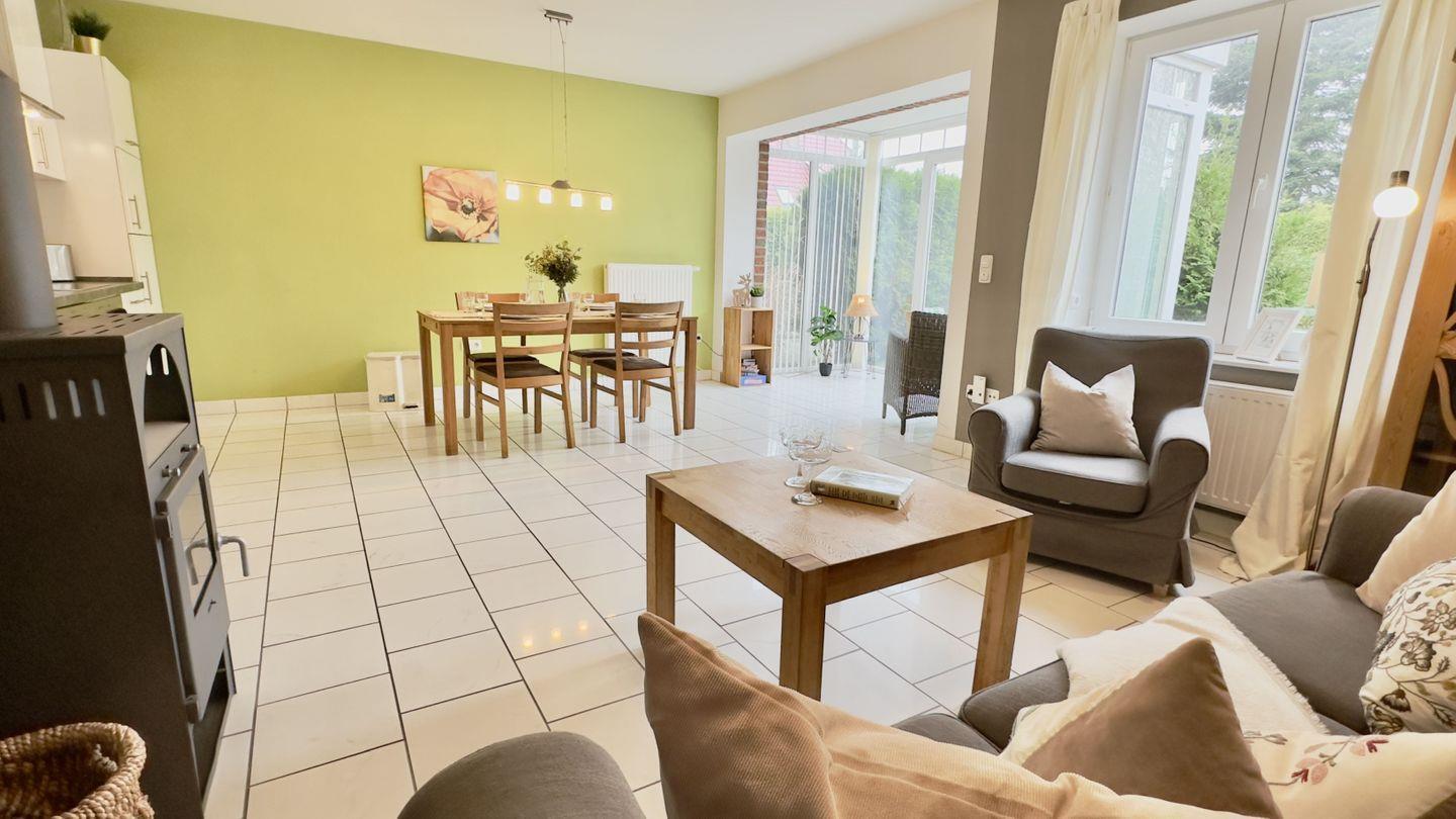 Das geräumige, offene Wohnzimmer ist das Herzstück der Wohnung. Es beeindruckt mit einem wunderschönen Wintergarten und einer großen Fensterfront, die viel Tageslicht hereinlässt und den Raum mit einer freundlichen, einladenden Atmosphäre erfüllt. Die gemütliche Sofaecke lädt dazu ein, die wohlige Wärme des Kamins zu genießen oder einfach den Blick ins Grüne schweifen zu lassen.