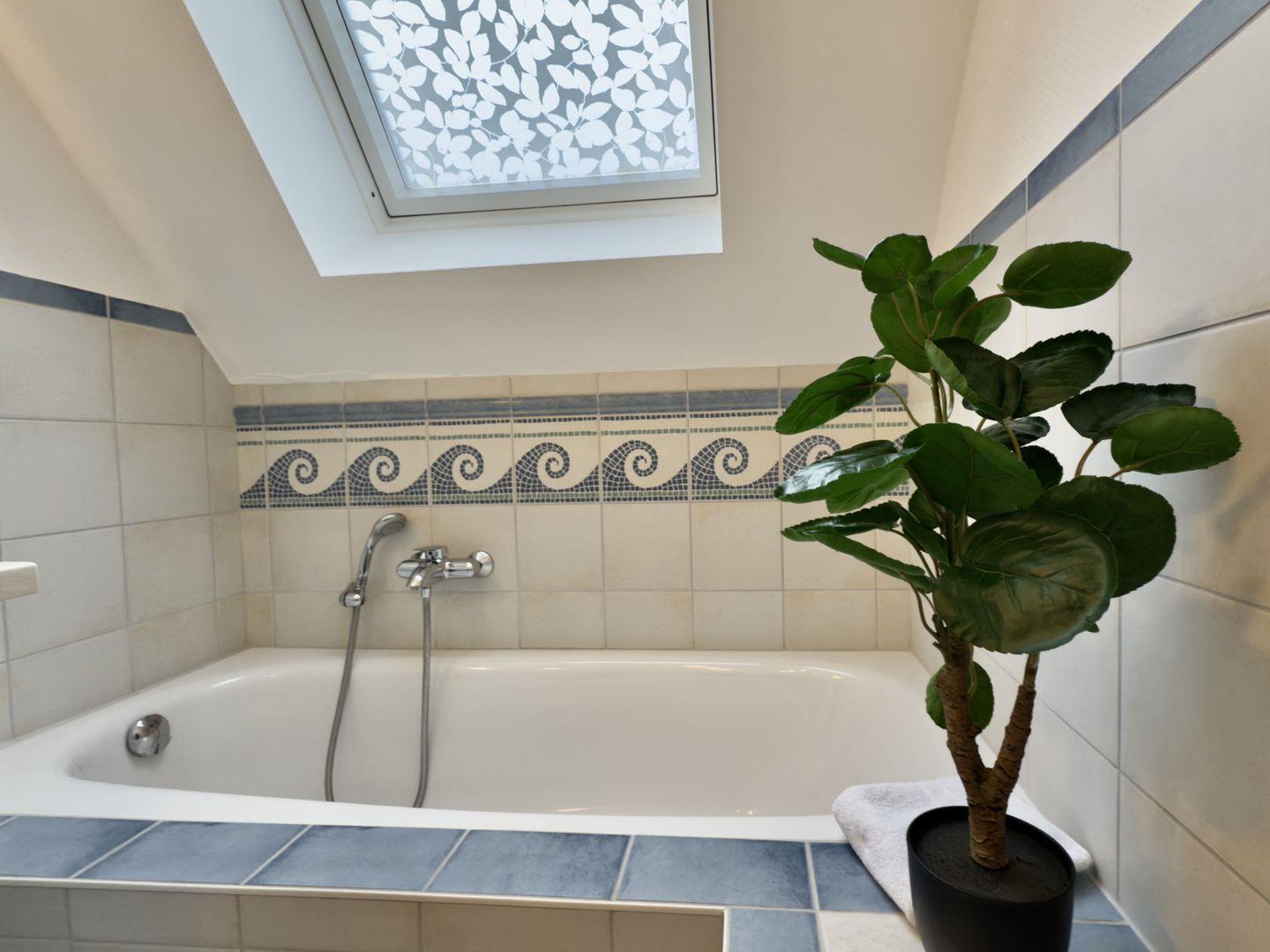 Der große Balkon, der an den Wohnbereich grenzt, bietet Raum für gemeinsame Sonnenstunden und lädt zum Entspannen ein. Die beiden Schlafzimmer im Erdgeschoss sowie das zusätzliche Schlafzimmer im Obergeschoss bieten erholsamen Schlaf und genügend Platz für alle Gäste. Das Tageslichtbadezimmer mit Badewanne und bodengleicher Dusche verspricht Entspannung pur.