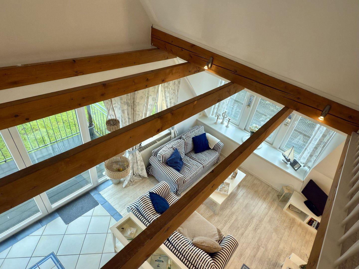 Über eine stabile Holztreppe gelangen Sie in die obere Etage, wo sich ein weiteres Schlafzimmer sowie ein Gäste-WC befinden. Der offene Blick hinunter in den Wohnbereich verleiht diesem Raum eine besondere Atmosphäre, die zum Träumen einlädt.