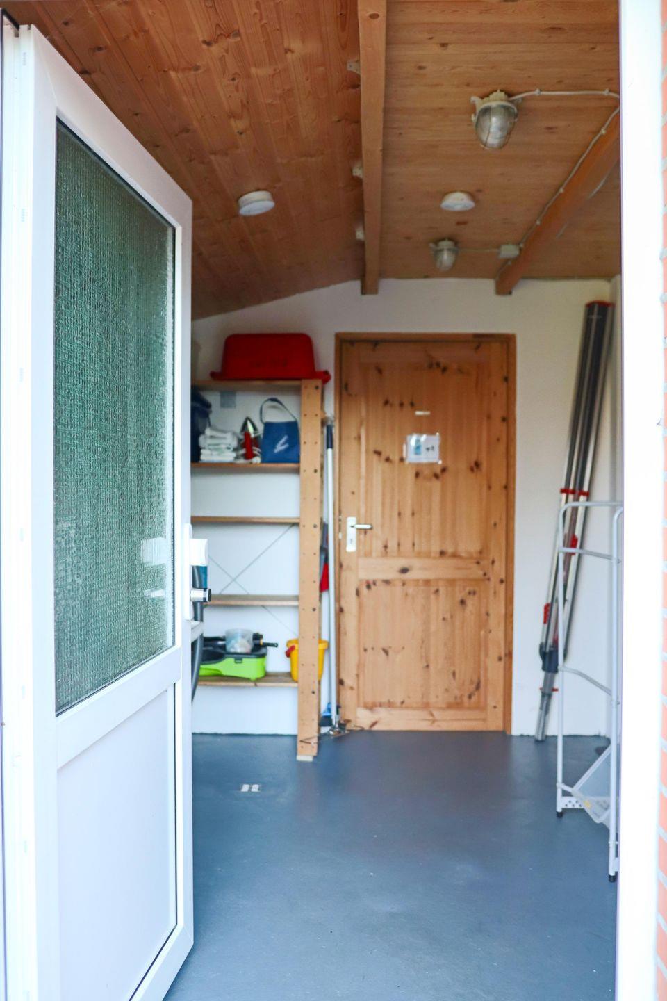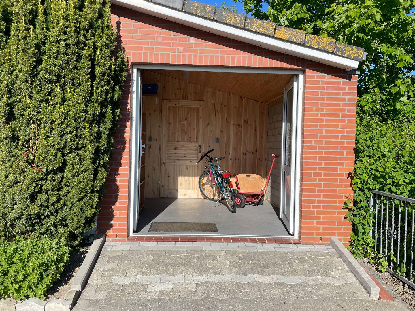 Für Ausflüge bestens ausgestattet: Ein Abstellraum mit Bollerwagen und ein Fahrradschuppen für eigene oder gemietete Räder sind vorhanden.