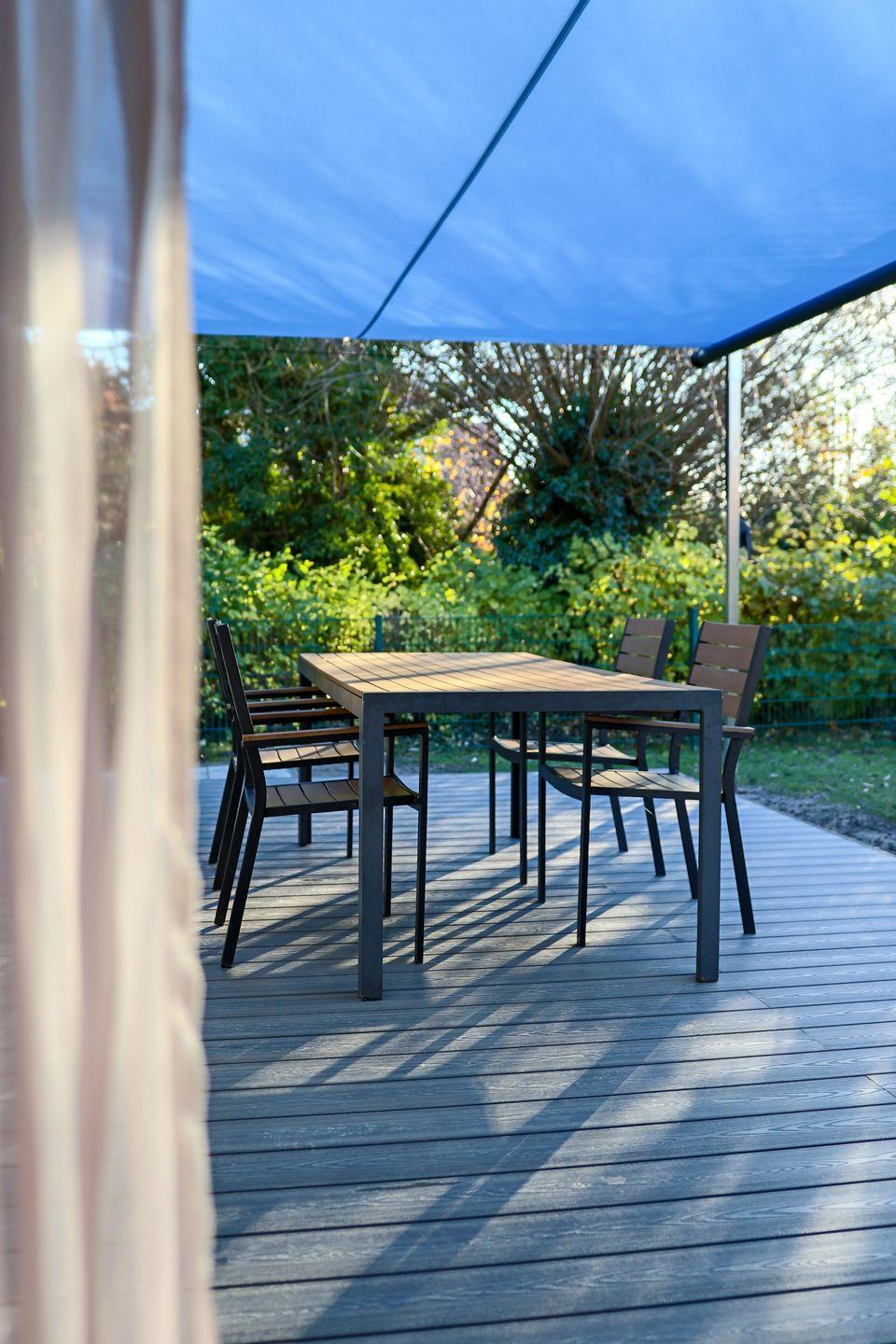 Der gepflegte Garten mit möblierter Terrasse, großem Sonnensegel und Liegewiese bietet viel Platz zum Entspannen. Der vollständig eingezäunte Garten sorgt für Sicherheit und Freiraum – besonders für Familien mit Kindern ein großer Pluspunkt.