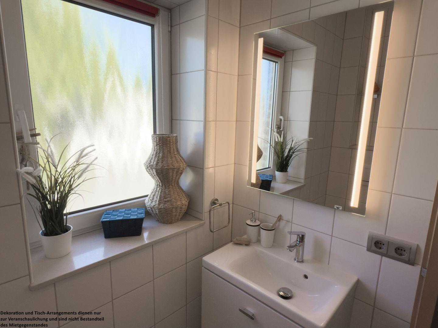 Im Obergeschoss befindet sich das stilvolle Badezimmer mit bodengleicher Dusche und großem Waschtisch. Ein Fenster sorgt für angenehmes Tageslicht, während ein großzügiger Unterschrank ausreichend Platz für Ihre Pflegeartikel bietet.