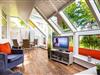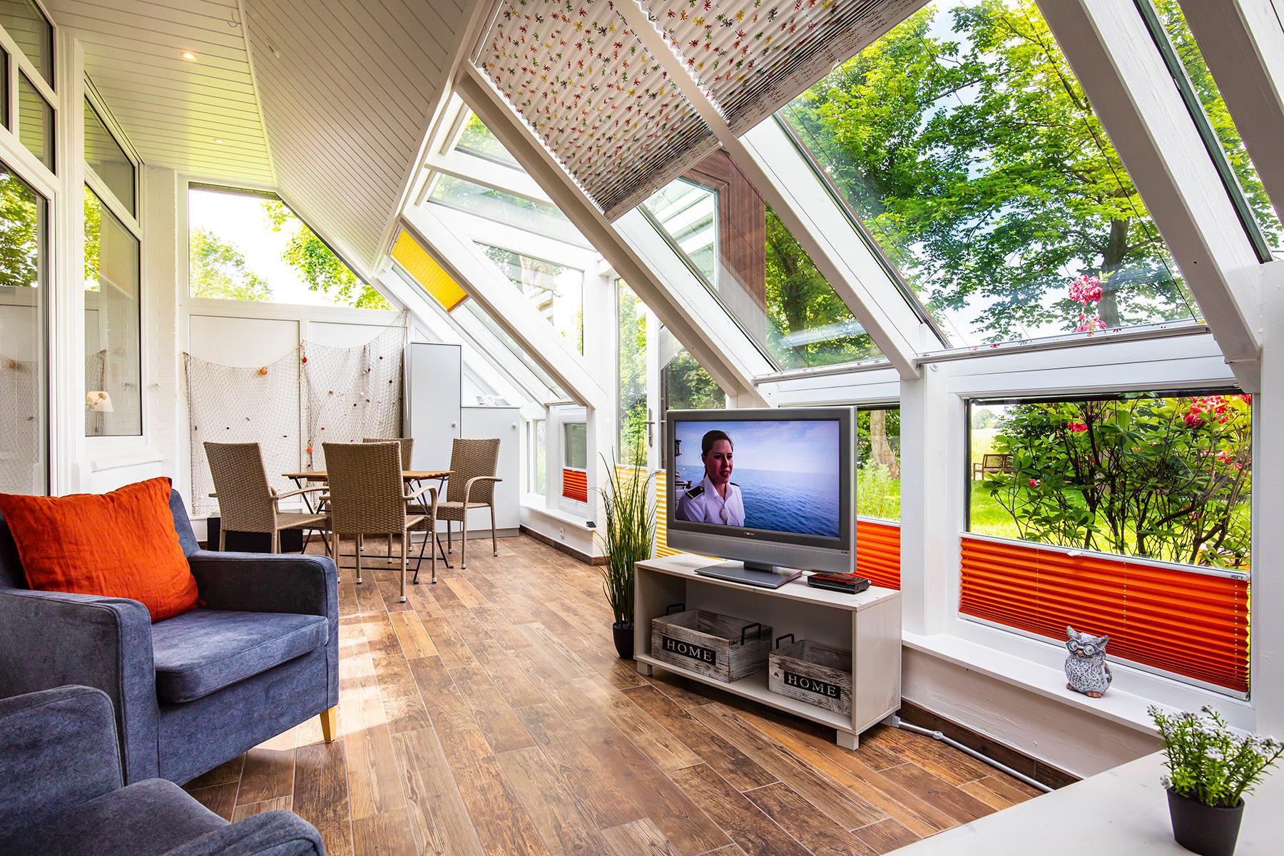 Links hinter der Küche befindet sich ein kleiner Vorraum, wo sich der Kühlschrank sowie Stauraum für Küchengeräte und Ihre Sachen befindet, sowie das angrenzende Duschbad mit Oberlichtfenster. Durch den offenen Küchen- und Essbereich, welcher auch über einen Kamin verfügt, gelangen Sie in den Wintergarten, der als moderner und gemütlicher Wohnbereich mit Blick auf die Harle eingerichtet ist. Von dort aus haben Sie freien Zugang auf die Grünflächen der Gemeinschaftsanlage und den Bootsanleger.