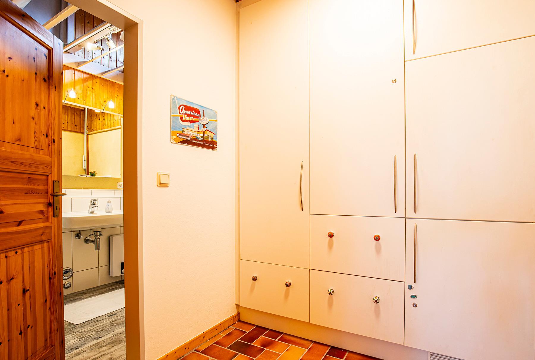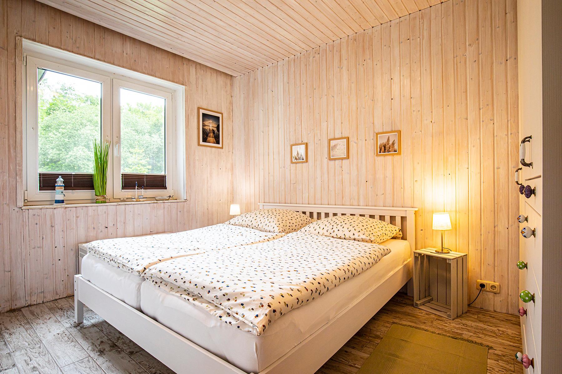 Durch einen kleinen Vorraum kommen Sie in den Flur, wo sich links und rechts je ein Schlafzimmer mit jeweils einem Doppelbett und Kleiderschrank befinden.