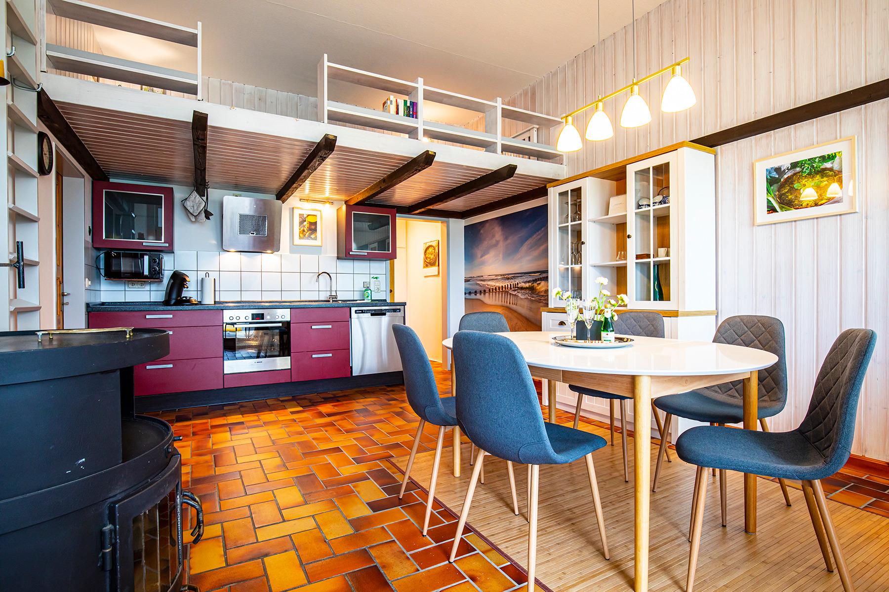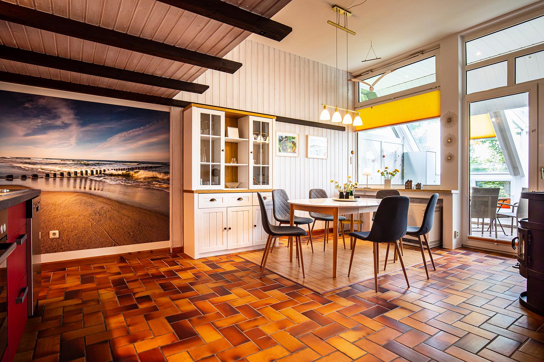Angrenzend kommen Sie in den offenen Küchen- und Essbereich, der Ihnen ausreichend Platz für alle Gäste bietet.