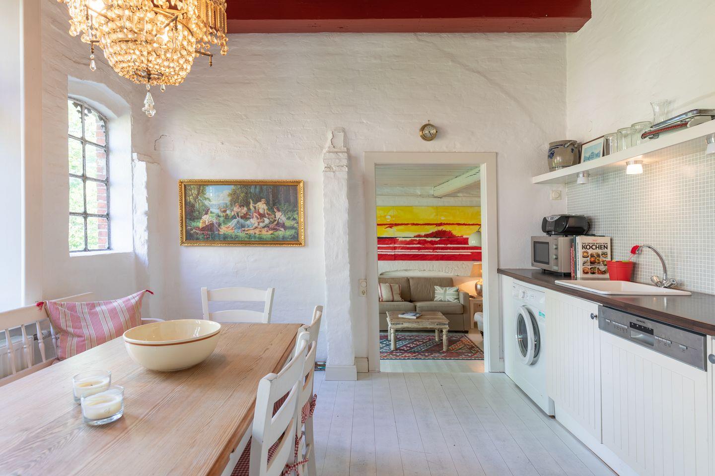 Die große, separate, sehr gut ausgestattete Küche verfügt über einen Kühlschrank mit Gefrierfach, Geschirrspüler, Waschmaschine, Herd, Backofen, Mikrowelle, Kaffeemaschine, Wasserkocher und Toaster. Die gemütliche Sitzecke bietet Platz für bis zu vier Personen.
