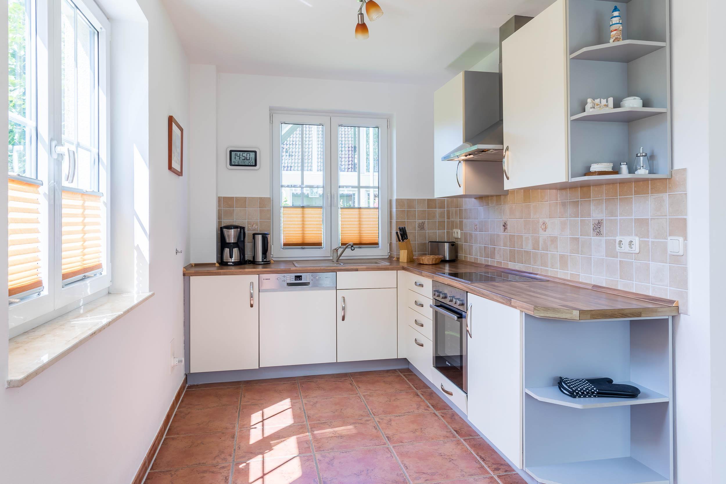 Die offene Küche verfügt über eine Vielzahl nützlicher Geräte, die das Zubereiten der Mahlzeiten erleichtern. Eine bequeme Essecke schließt sich an.