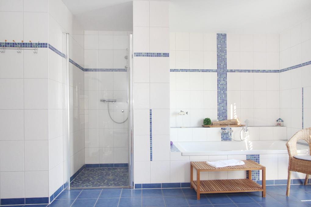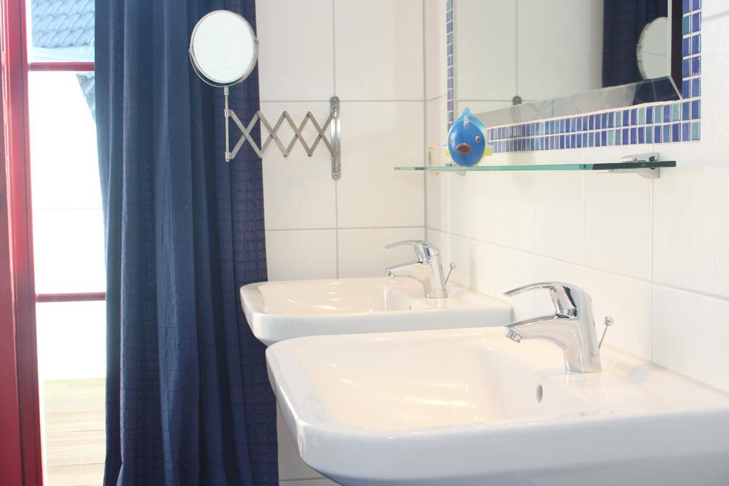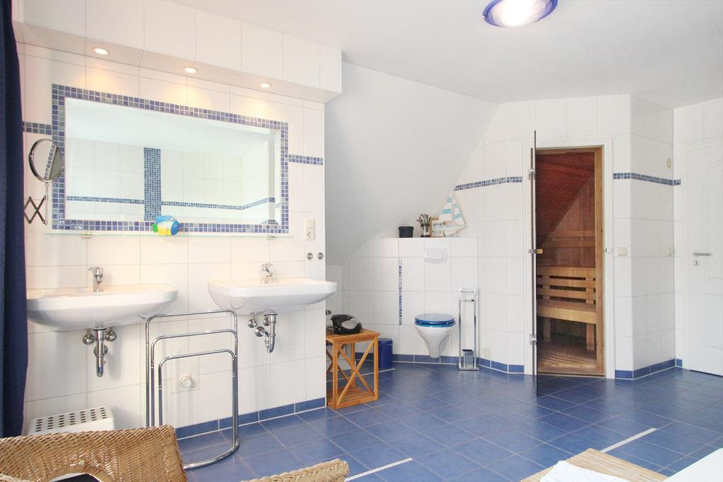 Im Badezimmer gibt es 2 Waschbecken, Dusche, WC, Badewanne und Sauna.